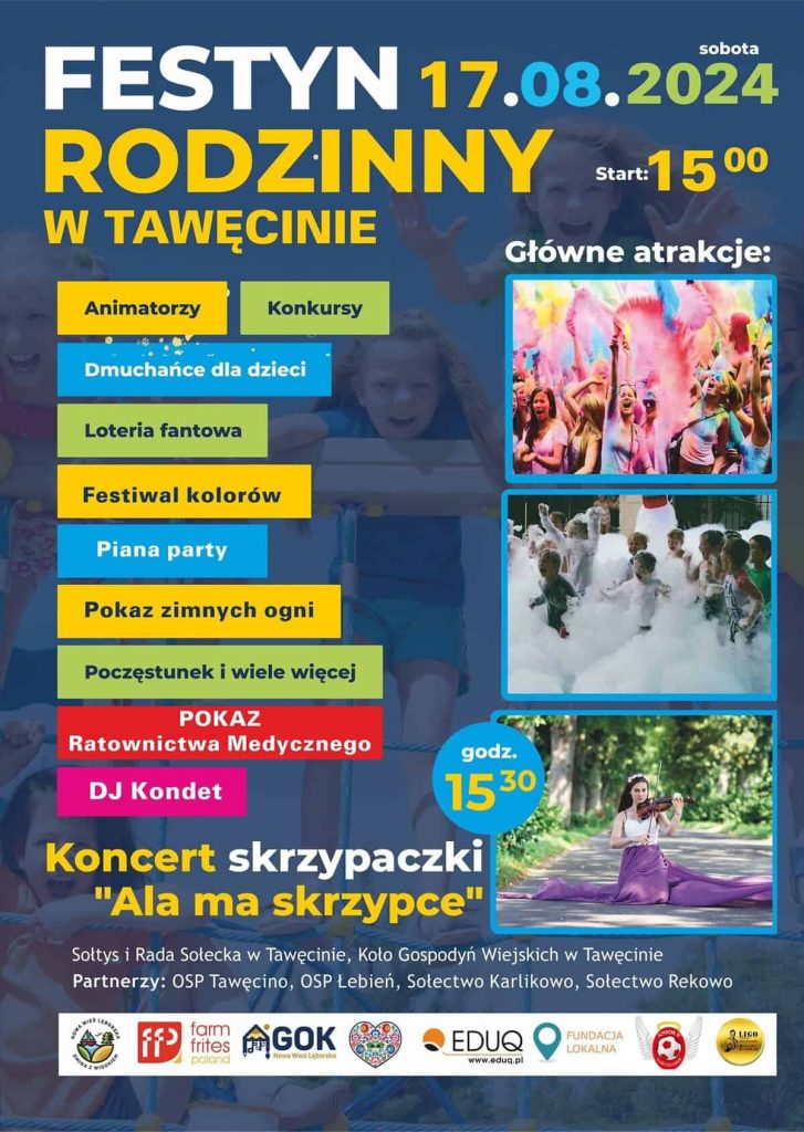 https://www.lebork24.info/2024/08/16/w-cewicach-zatancza-jak-za-dawnych-lat-szykuje-sie-potancowka-w-stylu-prl/ - Festyn rodzinny w Tawęcinie. Początek o godz. 15:00. W programie animatorzy, konkursy, dmuchańce dla dzieci, loteria fantowa, festiwal kolorów, piana party, pokaz zimnych ogni, pokaz ratownictwa medycznego, DJ Kondet i koncert skrzypaczki Ala ma skrzypce.