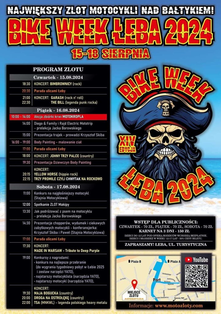 - Bike Week Łeba 2024 – Największy Zlot Motocyklowy nad Bałtykiem w dniach 15-18 sierpnia. Więcej o tym czytaj: