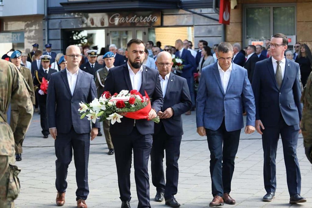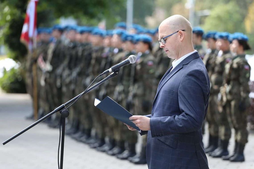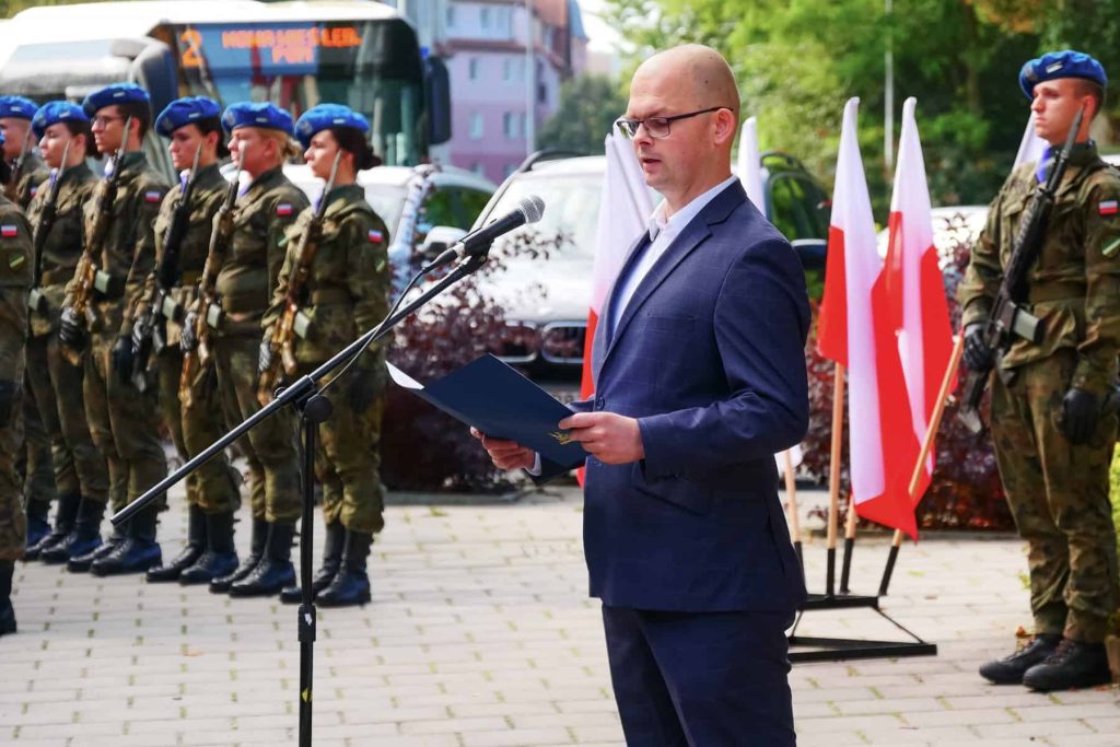– Myśląc o wybuchu wojny w Polsce w 1939 roku przed oczami mamy czarno-białe klisze: żołnierzy Wermachtu łamiących graniczny szlaban, bombardujące Wieluń samoloty czy wystrzały z dział pancernika Schleswig-Holstein – powiedział w swoim przemówieniu Jarosław Litwin. – Nam w Lęborku bliska jest jeszcze inna historia. Po mojej prawej stronie stoi pomnik poświęcony obronie Polskiej Poczty w Gdańsku. Mijamy go w ciągu roku wielokrotnie i bezwiednie, a przecież symbolizuje on wielką sprawę. Napis na granitowej płycie brzmi: „Bohaterskim Obrońcom Poczty Polskiej w Gdańsku w dziesiątą rocznicę. Pocztowcy Lęborka. 1 września 1949 roku”. Zaledwie cztery lata po zakończeniu wojny, jeszcze w gruzach żyli tu ludzie, którzy postanowili upamiętnić obrońców poczty i dzięki nim właśnie tutaj się spotykamy. To piękna kontynuacja pamięci kolejnych pokoleń lęborczan (…).