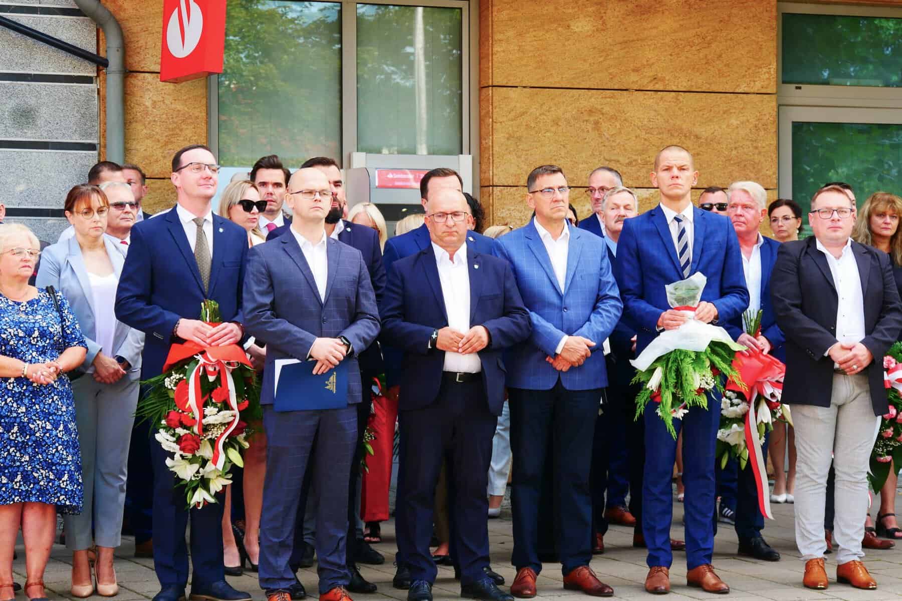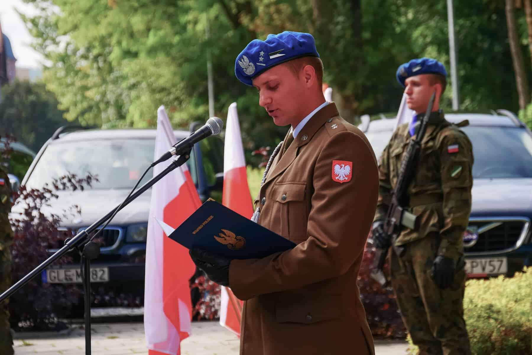 – Myśląc o wybuchu wojny w Polsce w 1939 roku przed oczami mamy czarno-białe klisze: żołnierzy Wermachtu łamiących graniczny szlaban, bombardujące Wieluń samoloty czy wystrzały z dział pancernika Schleswig-Holstein – powiedział w swoim przemówieniu Jarosław Litwin. – Nam w Lęborku bliska jest jeszcze inna historia. Po mojej prawej stronie stoi pomnik poświęcony obronie Polskiej Poczty w Gdańsku. Mijamy go w ciągu roku wielokrotnie i bezwiednie, a przecież symbolizuje on wielką sprawę. Napis na granitowej płycie brzmi: „Bohaterskim Obrońcom Poczty Polskiej w Gdańsku w dziesiątą rocznicę. Pocztowcy Lęborka. 1 września 1949 roku”. Zaledwie cztery lata po zakończeniu wojny, jeszcze w gruzach żyli tu ludzie, którzy postanowili upamiętnić obrońców poczty i dzięki nim właśnie tutaj się spotykamy. To piękna kontynuacja pamięci kolejnych pokoleń lęborczan (…).