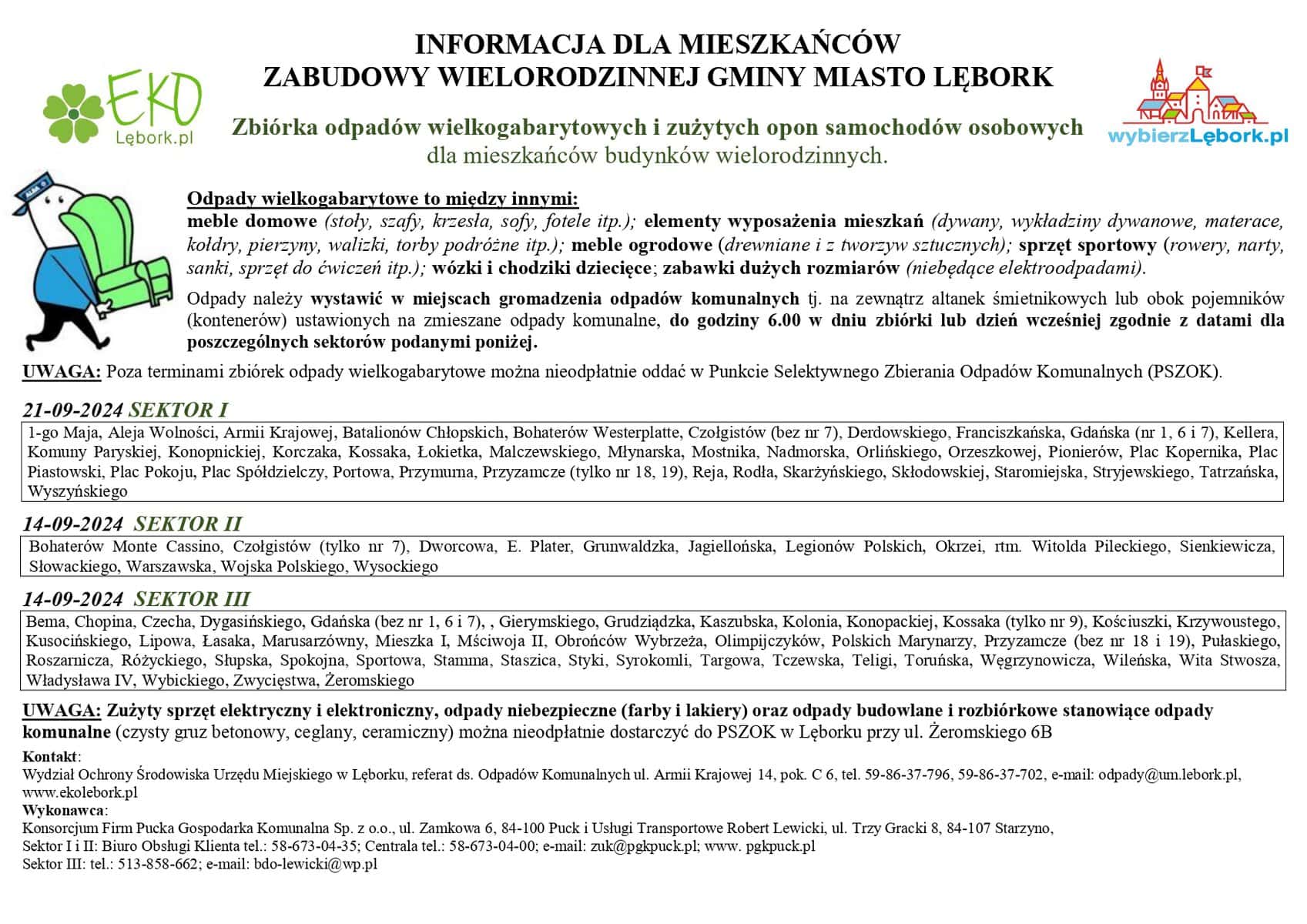 Odpady wystawione w innym terminie nie będą odbierane w ramach gminnego systemu gospodarowania odpadami. W przypadku pozostawienia ich w rejonie wiat śmietnikowych poza terminem zbiórki ich usunięciem będzie się musiał zająć władający nieruchomością, co w rezultacie będzie obciążało wszystkich mieszkańców korzystających z danego miejsca zbiórki odpadów komunalnych. Odpady wielkogabarytowe oraz zużyte opony można także w dowolnym terminie przekazać nieodpłatnie do Punktu Selektywnej Zbiórki Odpadów Komunalnych (PSZOK) znajdującego się w Lęborku przy ul. Żeromskiego 6B.