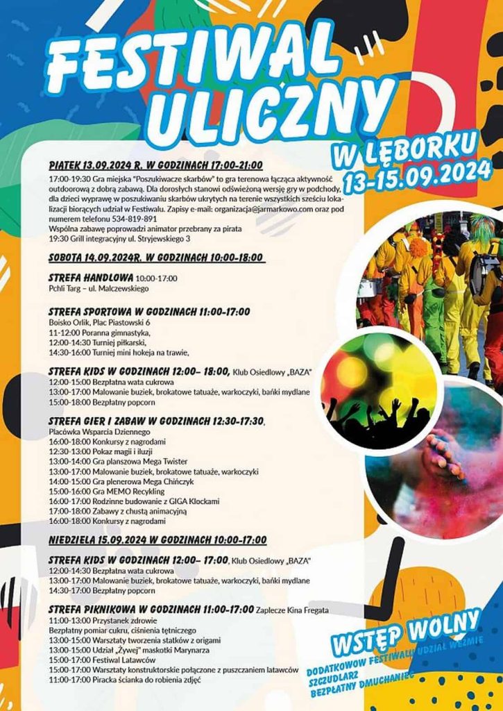 Zaplanowane na piątek, 13 września, wydarzenia w ramach Lęborskiego Festiwalu Ulicznego w Lęborku nie odbędą się z powodu długotrwałych opadów deszczu. Organizator zmienił harmonogram i przełożył je na niedzielę, 15 września. Zmiany dotyczą gry miejskiej i integracyjnego grilla.
