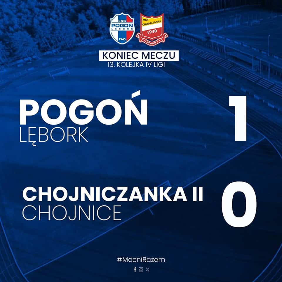 Piłkarze Pogoni Lębork wygrali w sobotę, 26 października, u siebie z Chojniczanką II Chojnice 1:0 w meczu 13. kolejki rundy jesiennej IV ligi sezonu 2024/2025. To piąta wygrana lęborczan w rozgrywkach.