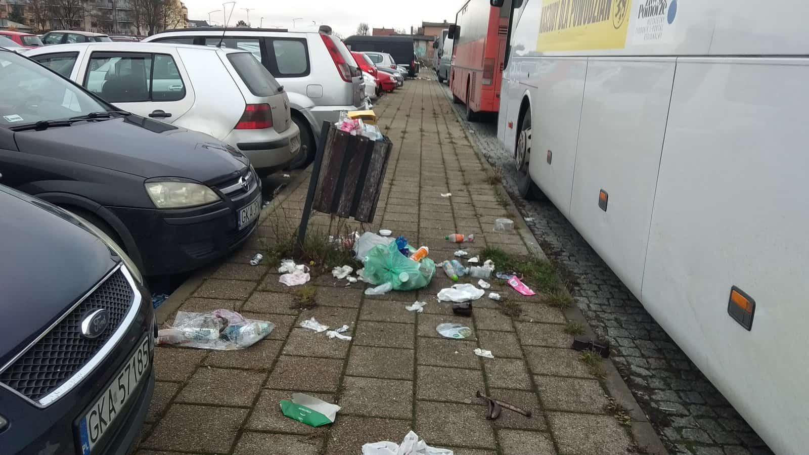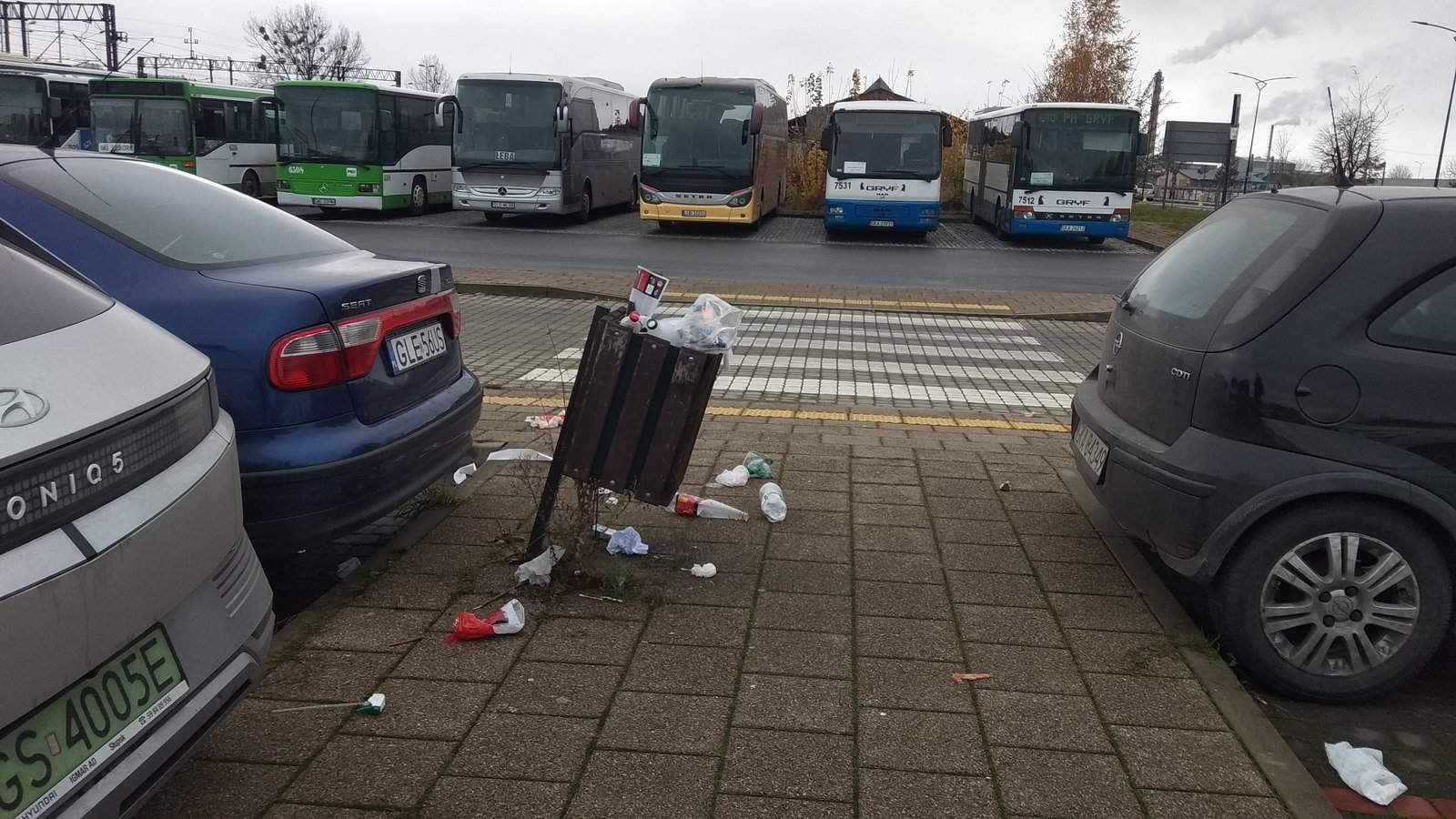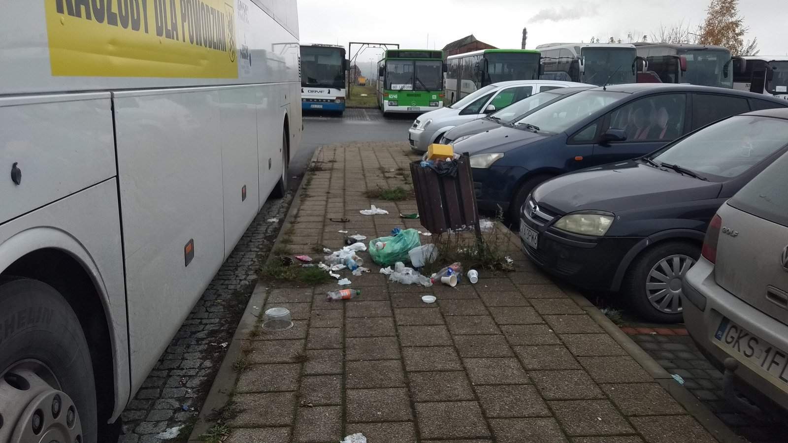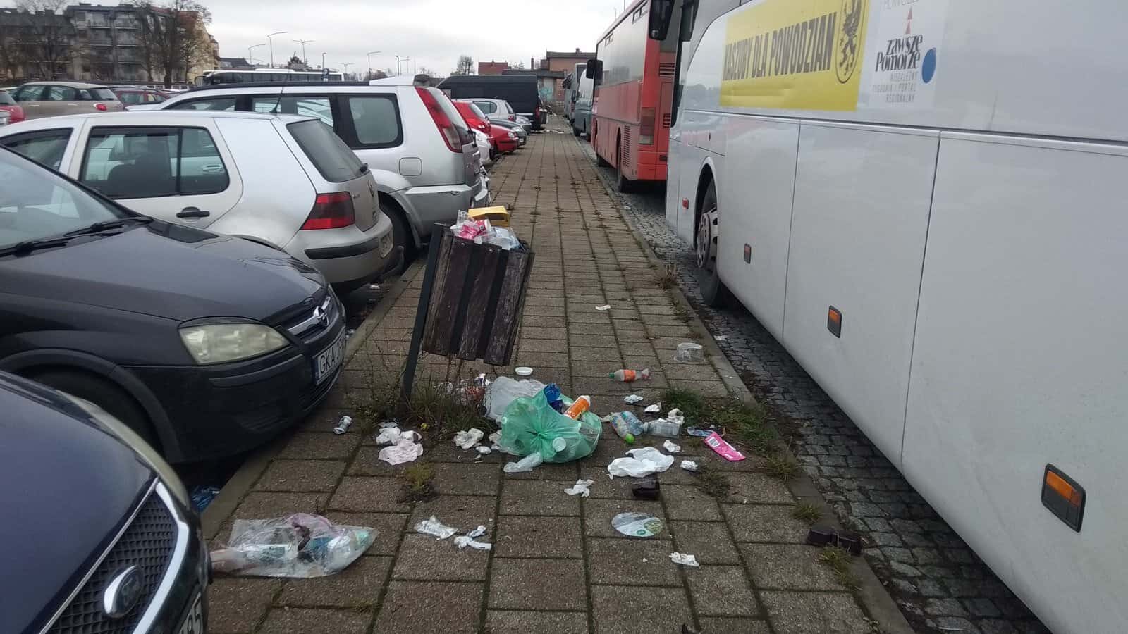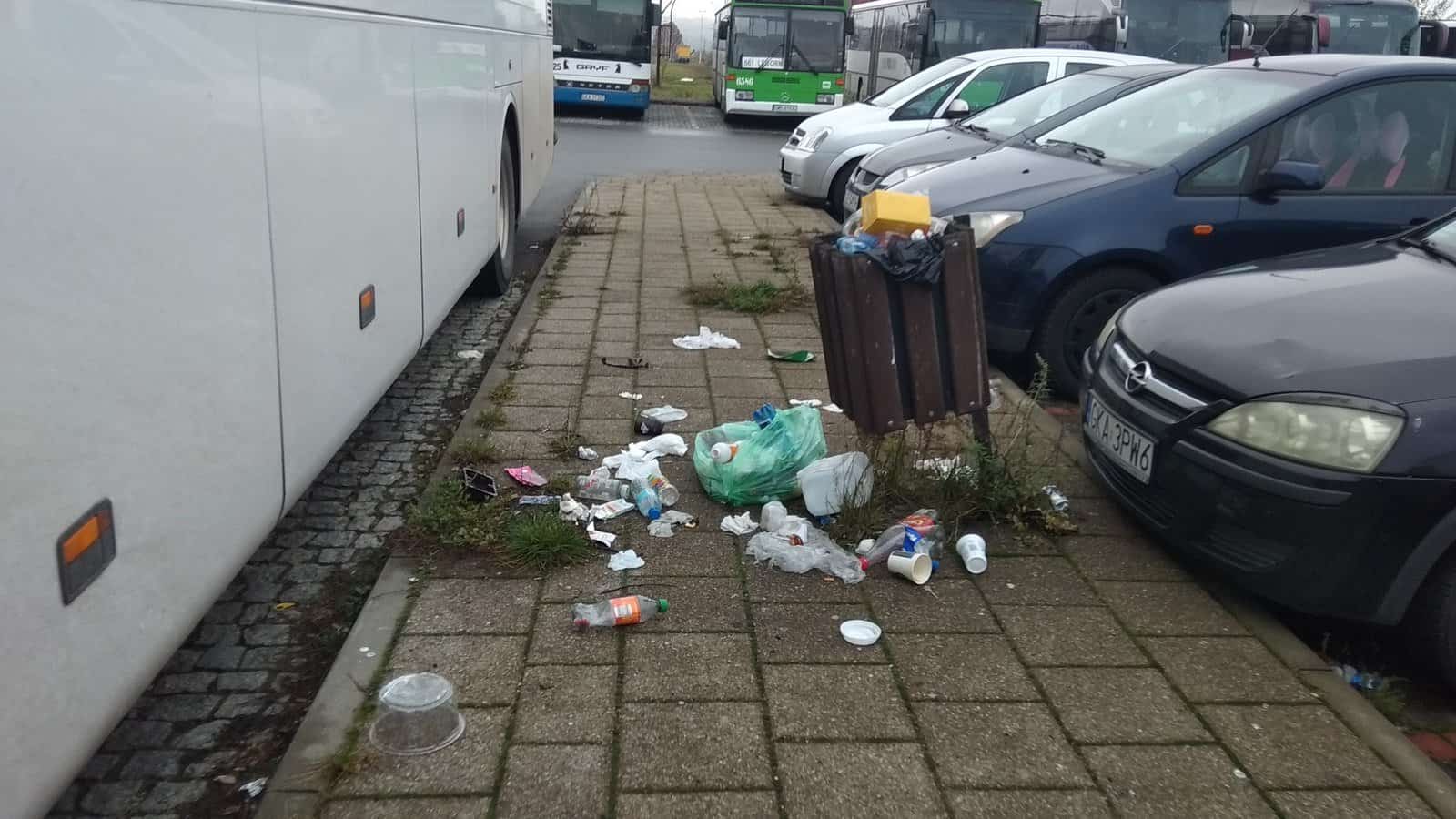 Jeszcze gorzej jest w rejonie parkingu dla autobusów i parkingu dla samochodów osobowych. Na chodniku pomiędzy pojazdami aż roi się od przepełnionych koszy. Odpadów jest tak dużo, że trudno jest przejść. Z pojemników wysypują się m.in. papiery, chusteczki, worki foliowe i plastikowe butelki po rozmaitych napojach. Natrafić można też na kartonowe pudełka, które nie mieszczą się w środku, a pracownicy sprzątający teren dworca nie nadążają z opróżnianiem koszy.