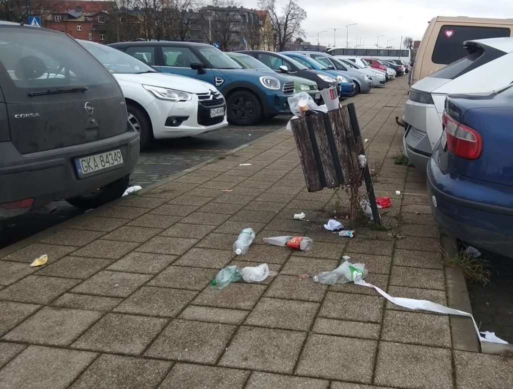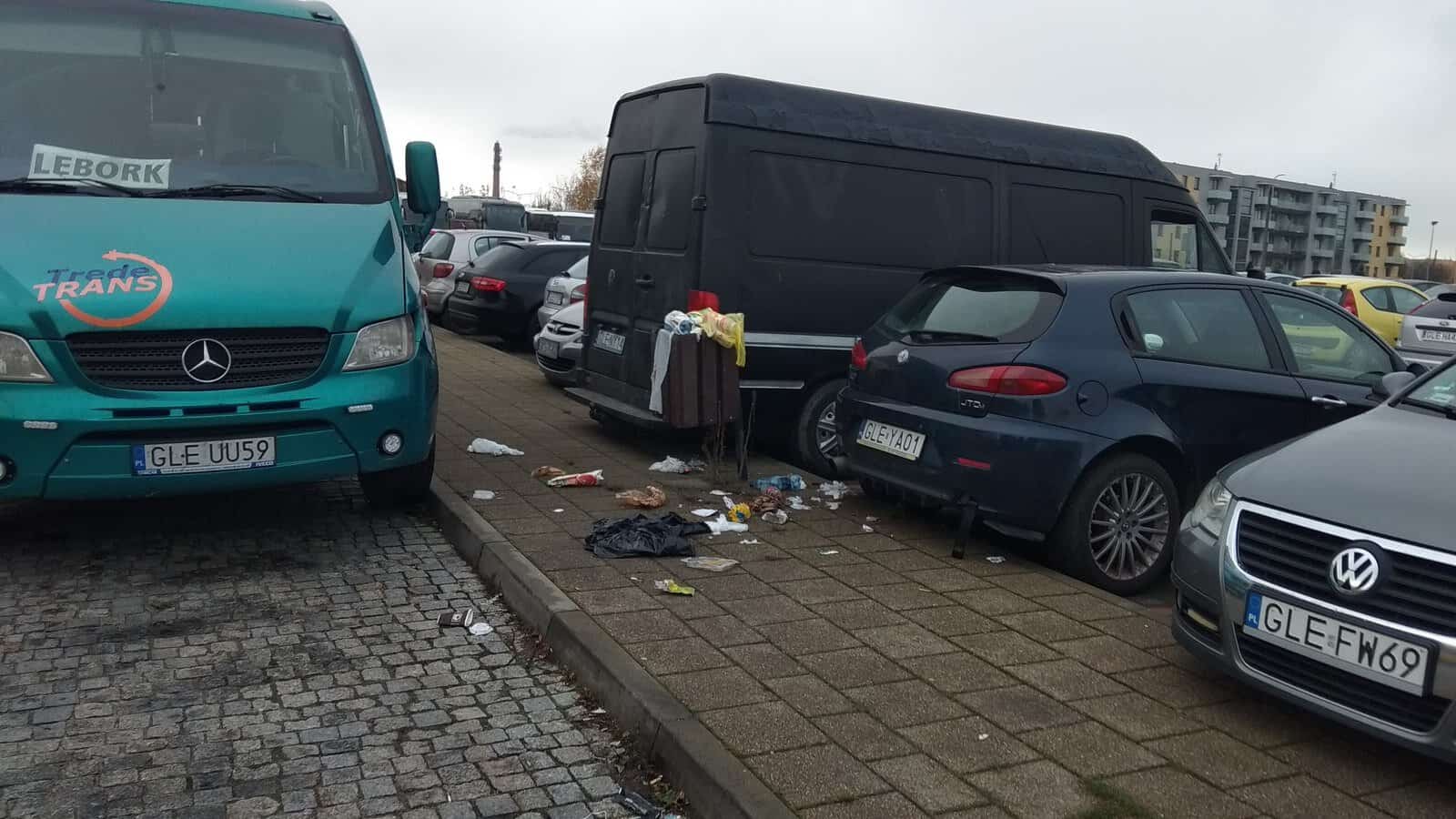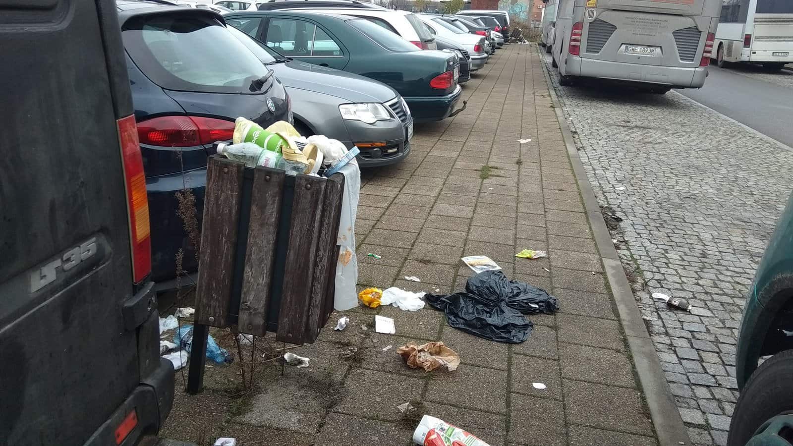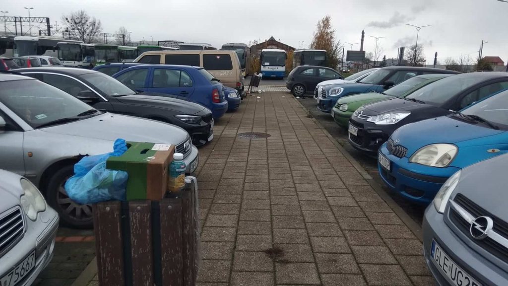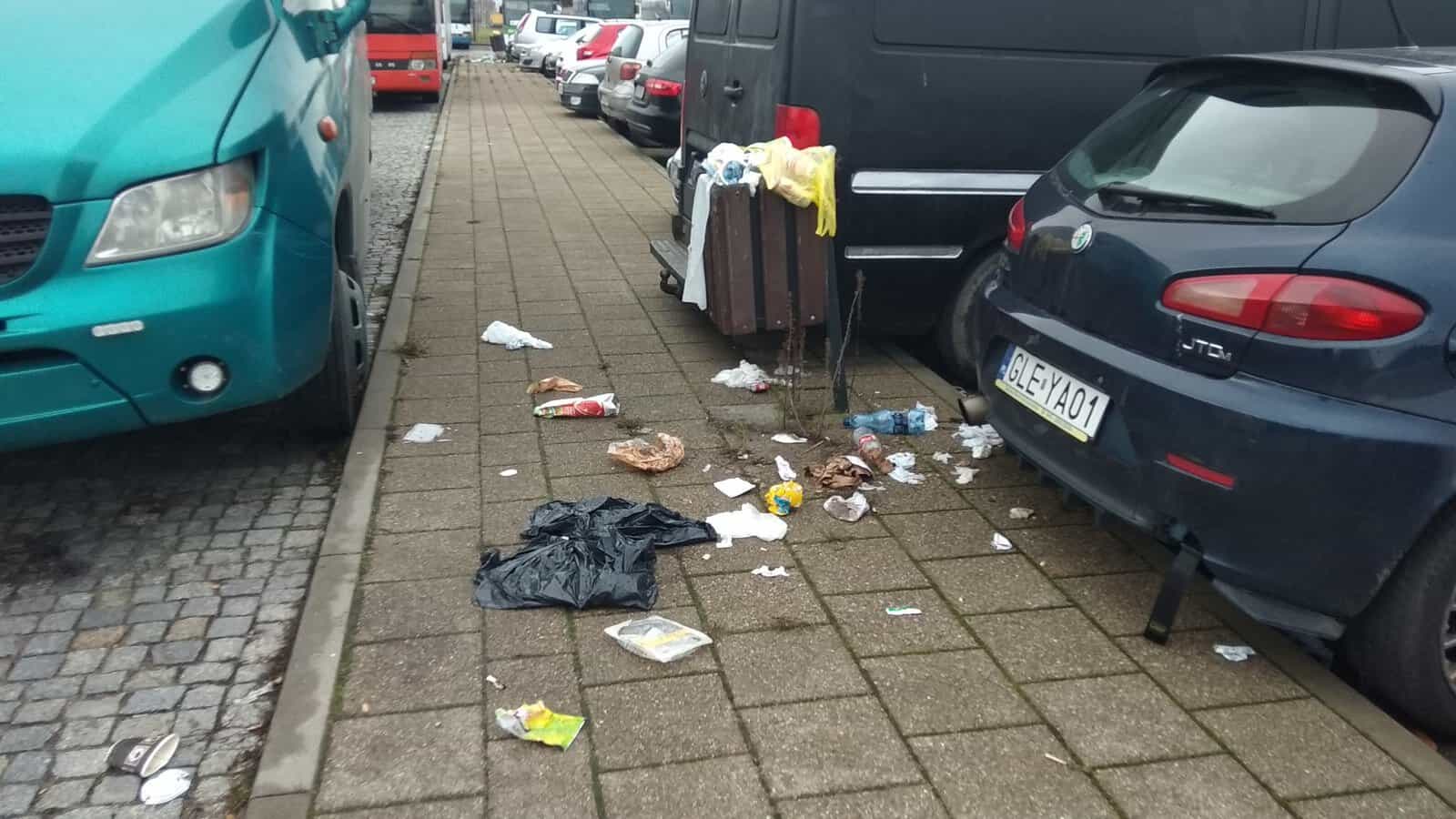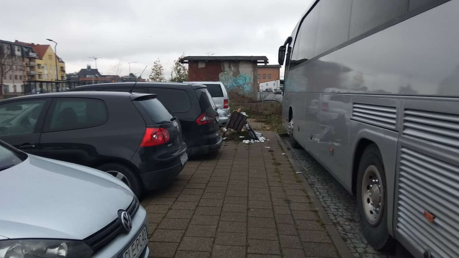 Jeszcze gorzej jest w rejonie parkingu dla autobusów i parkingu dla samochodów osobowych. Na chodniku pomiędzy pojazdami aż roi się od przepełnionych koszy. Odpadów jest tak dużo, że trudno jest przejść. Z pojemników wysypują się m.in. papiery, chusteczki, worki foliowe i plastikowe butelki po rozmaitych napojach. Natrafić można też na kartonowe pudełka, które nie mieszczą się w środku, a pracownicy sprzątający teren dworca nie nadążają z opróżnianiem koszy.