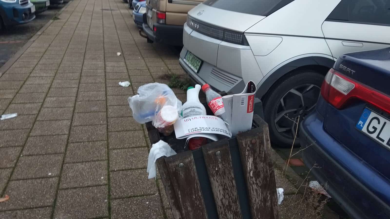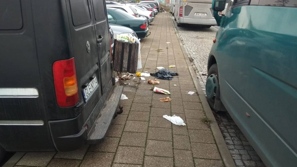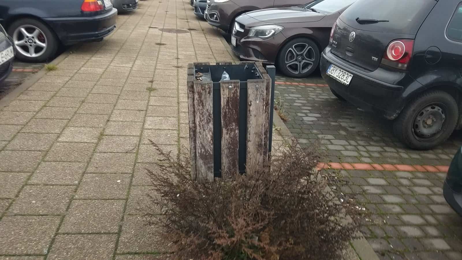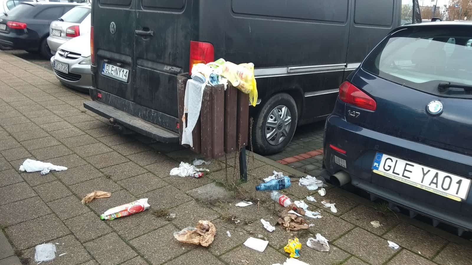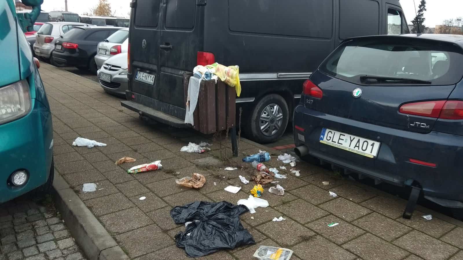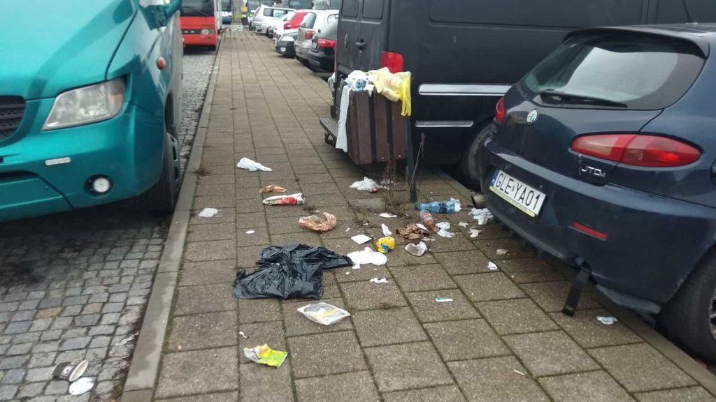 Jeszcze gorzej jest w rejonie parkingu dla autobusów i parkingu dla samochodów osobowych. Na chodniku pomiędzy pojazdami aż roi się od przepełnionych koszy. Odpadów jest tak dużo, że trudno jest przejść. Z pojemników wysypują się m.in. papiery, chusteczki, worki foliowe i plastikowe butelki po rozmaitych napojach. Natrafić można też na kartonowe pudełka, które nie mieszczą się w środku, a pracownicy sprzątający teren dworca nie nadążają z opróżnianiem koszy.