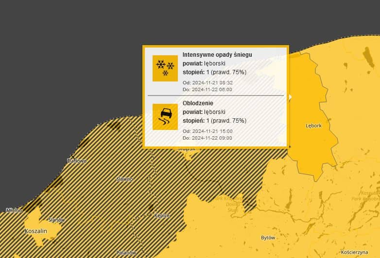 IMGW wydało ostrzeżenie pierwszego stopnia dla powiatu lęborskiego przed intensywnymi opadami śniegu oraz oblodzeniem. Prognozowane są opady śniegu powodujące miejscami przyrost pokrywy śnieżnej o 10 cm do 20 cm. Prognozuje się zamarzanie mokrej nawierzchni dróg i chodników po opadach deszczu mokrego śniegu powodujące ich oblodzenie. Temperatura minimalna około od -4°C do 0°C, temperatura minimalna przy gruncie około -5°C.
