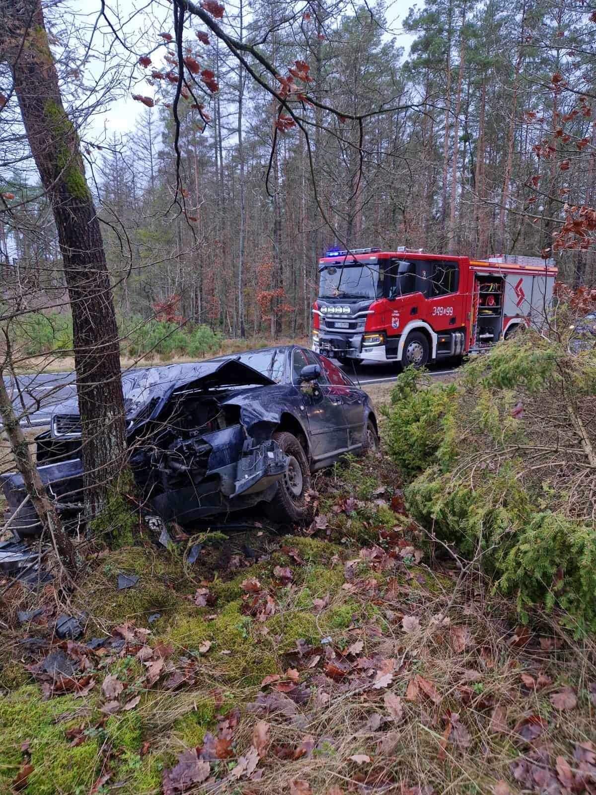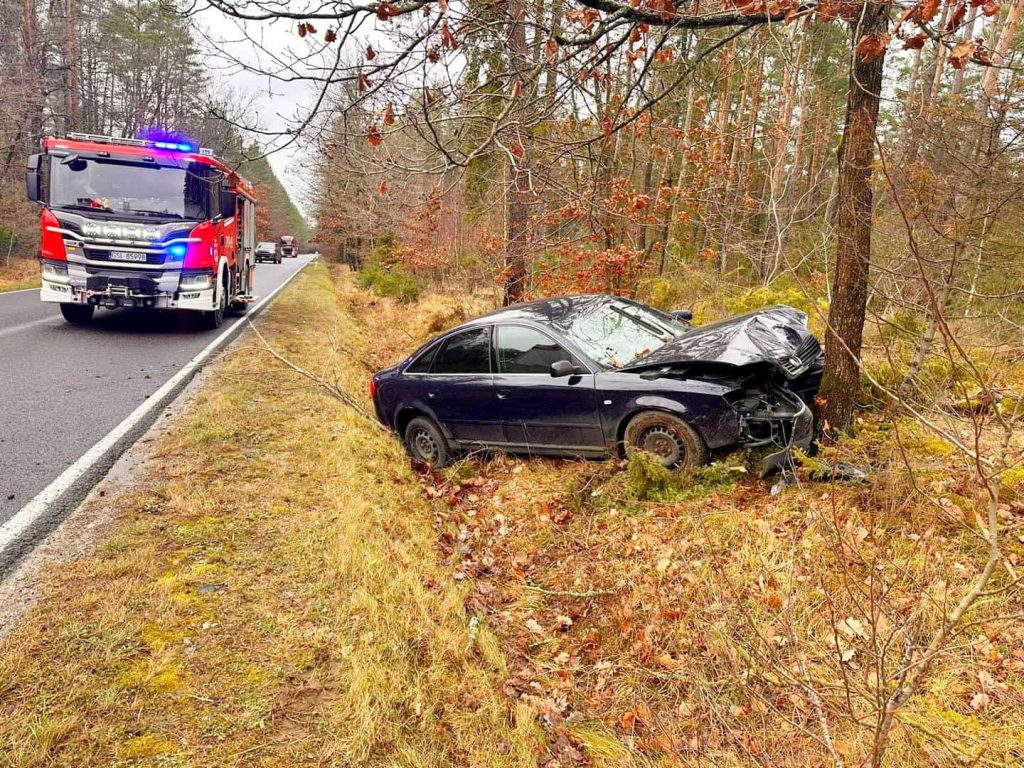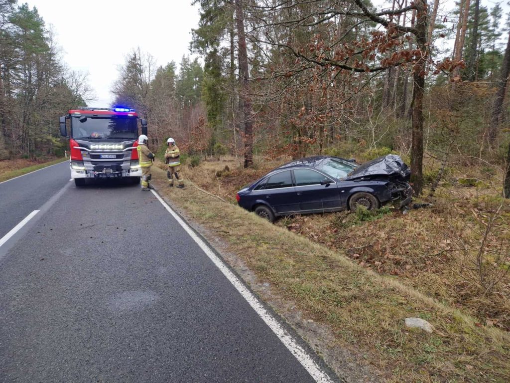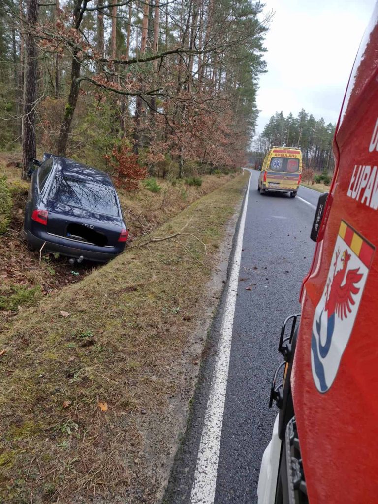 Na DW 211 w okolicach Łupawy osobowe audi uderzyło w drzewo. 65-latek zasłabł za kierownicą. Kierowca i pasażer zostali przewiezieni do szpitala.