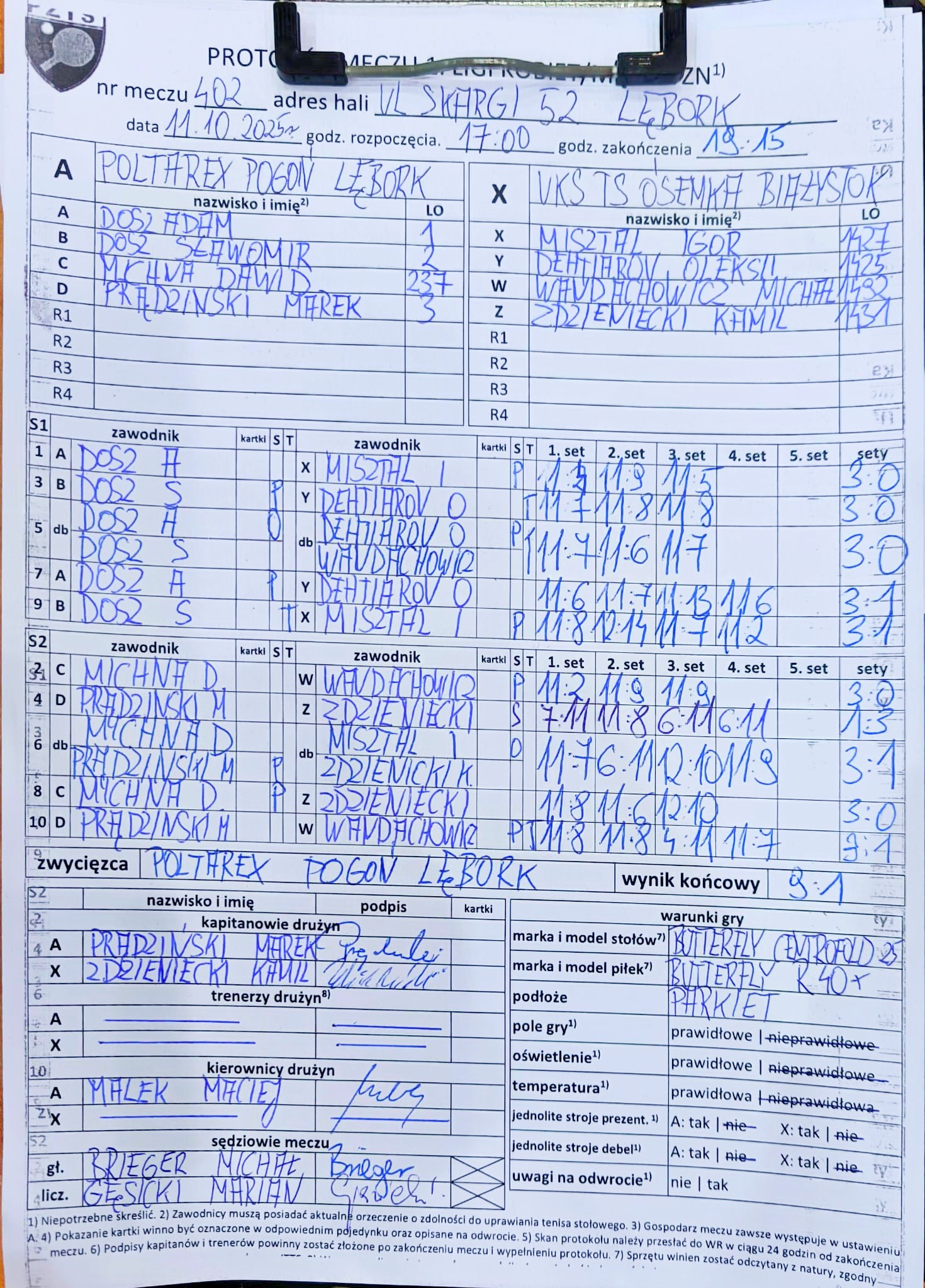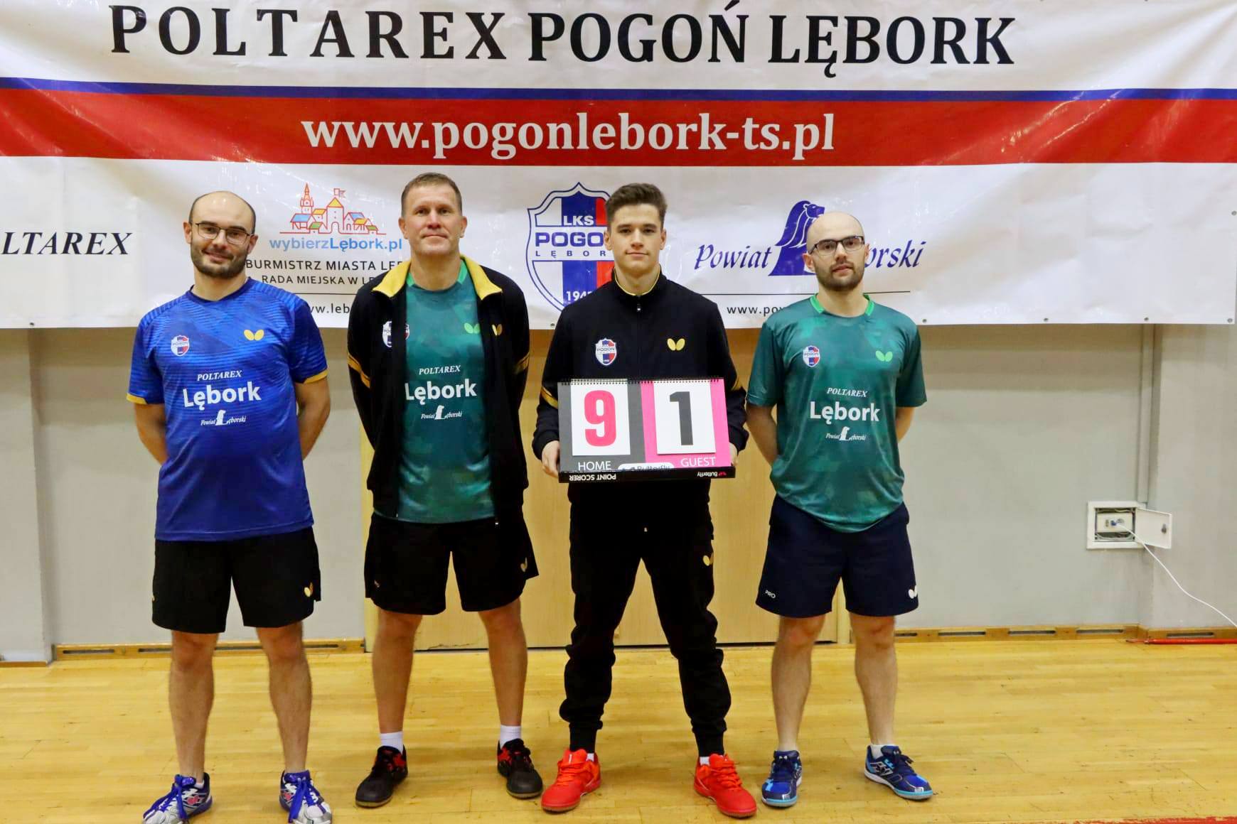 Tenisiści stołowi Poltarex Pogoni Lębork wygrali u siebie w sobotę, 11 października, z UKSTS Ósemka Białystok 9:1 w meczu 1. kolejki rundy jesiennej sezonu 2025/2026 I ligi grupy północnej. To pierwsze zwycięstwo lęborczan w tych rozgrywkach. Kolejny mecz już dziś o godzinie 17:00 w hali przy ulicy Piotra Skargi.