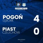 – Mecz rozpoczął się dla nas bardzo dobrze – powiedział po meczu Mateusz Michniewicz, trener Pogoni Lębork. – Stworzyliśmy sobie w ciągu pierwszych 5 minut dwie groźne sytuacje. Chwilę później dostaliśmy rzut karny za faul na Michale Balewskim. Pewnie wykorzystał go Dawid Patelczyk. Później mieliśmy jeszcze dobre sytuacje po stałych fragmentach. Potem przyszedł kwadrans przestoju, gdzie mecz się trochę wyrównał. Piast przeniósł grę na naszą połowę, oddali dwa, trzy groźne uderzenia z dystansu. Całe szczęście przed przerwą po fajnie rozegranym rzucie wolnym Kuba Bach głową strzelił bramkę z asystą Krystiana Faltyńskiego, później Alex Kolasa świetnie się odnalazł po dośrodkowaniu Nikodema Czarneckiego i do przerwy było 3:0. W drugiej połowie szybkie podwyższenie przez Alexa i pełna kontrola meczu. Wykonaliśmy nasz plan. Pewne zwycięstwo bez kontuzji i kartek. Oby tak dalej. Teraz skupiamy się na ważnym tygodniu. Już w środę gramy mecz pucharowy z Pomorzem Potęgowo, potem jedziemy do Sokoła Bożepole. Chcemy awansować w pucharze i zdobyć trzy punkty w lidze.