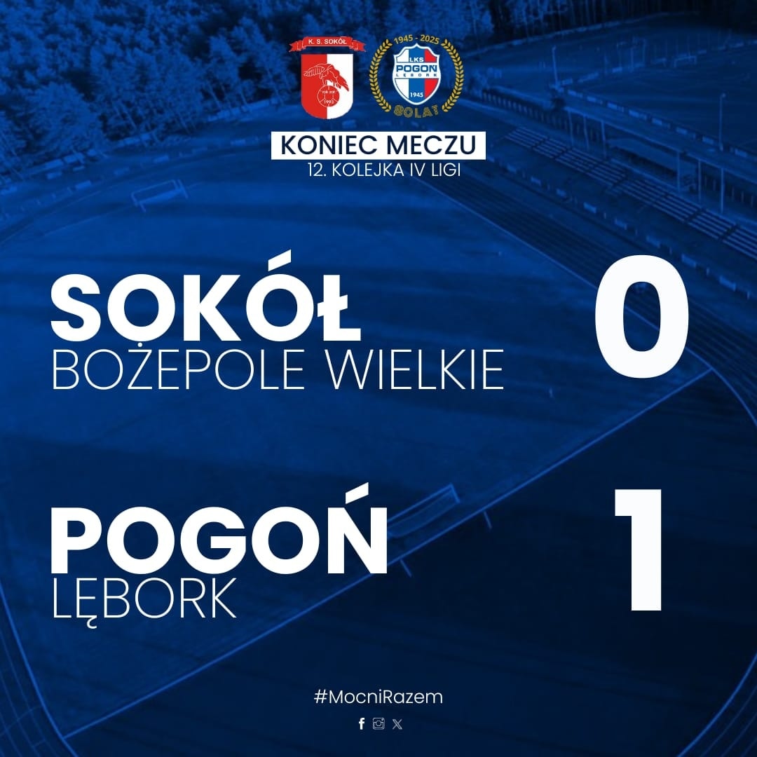 Piłkarze Pogoni Lębork wygrali w sobotę, 18 października, na wyjeździe z Sokołem Bożepole Wielkie 1:0 w meczu 12. kolejki rundy jesiennej IV ligi sezonu 2025/2026. To szóste zwycięstwo lęborczan w tym sezonie.