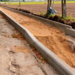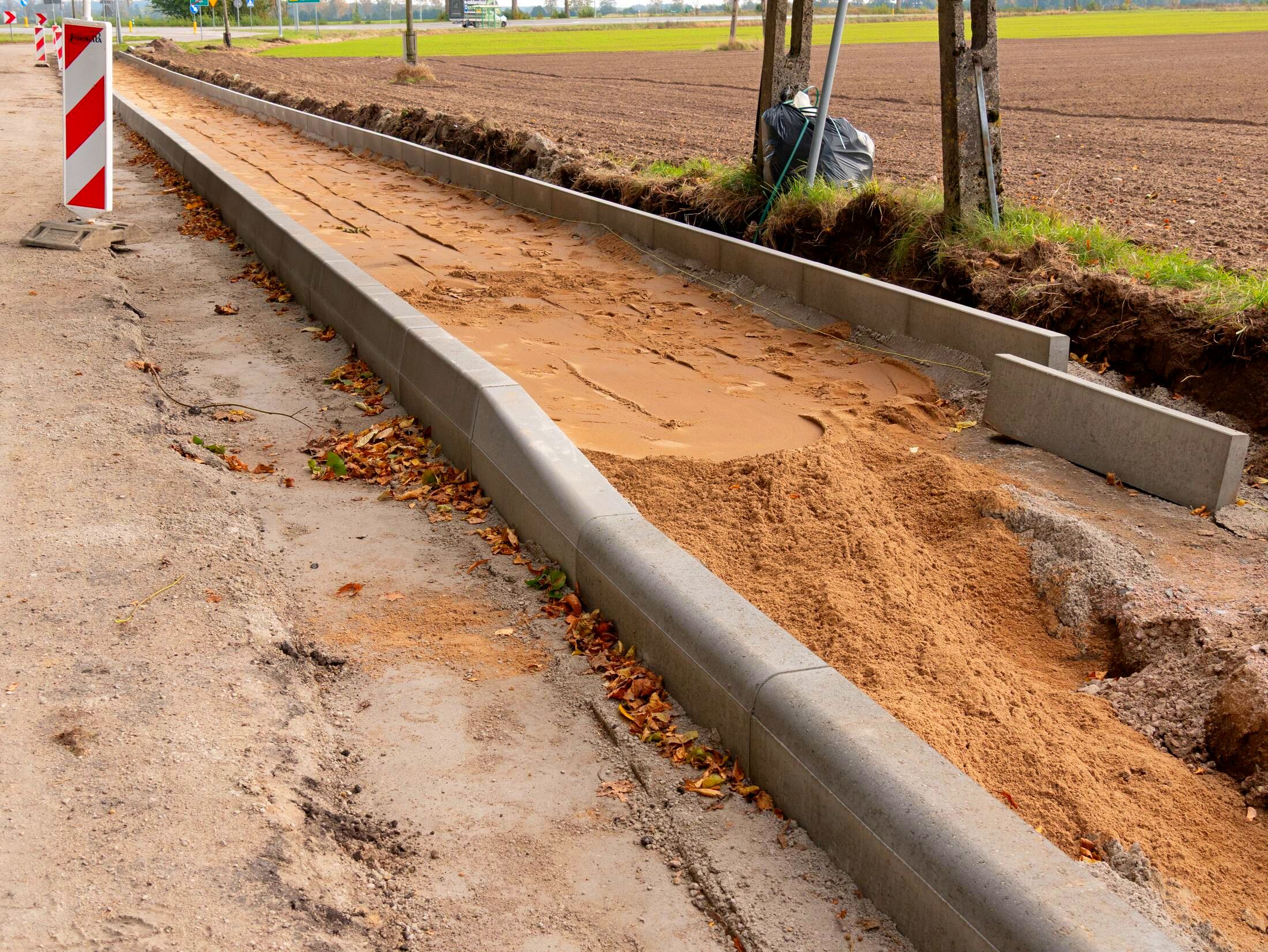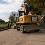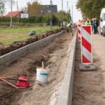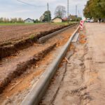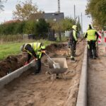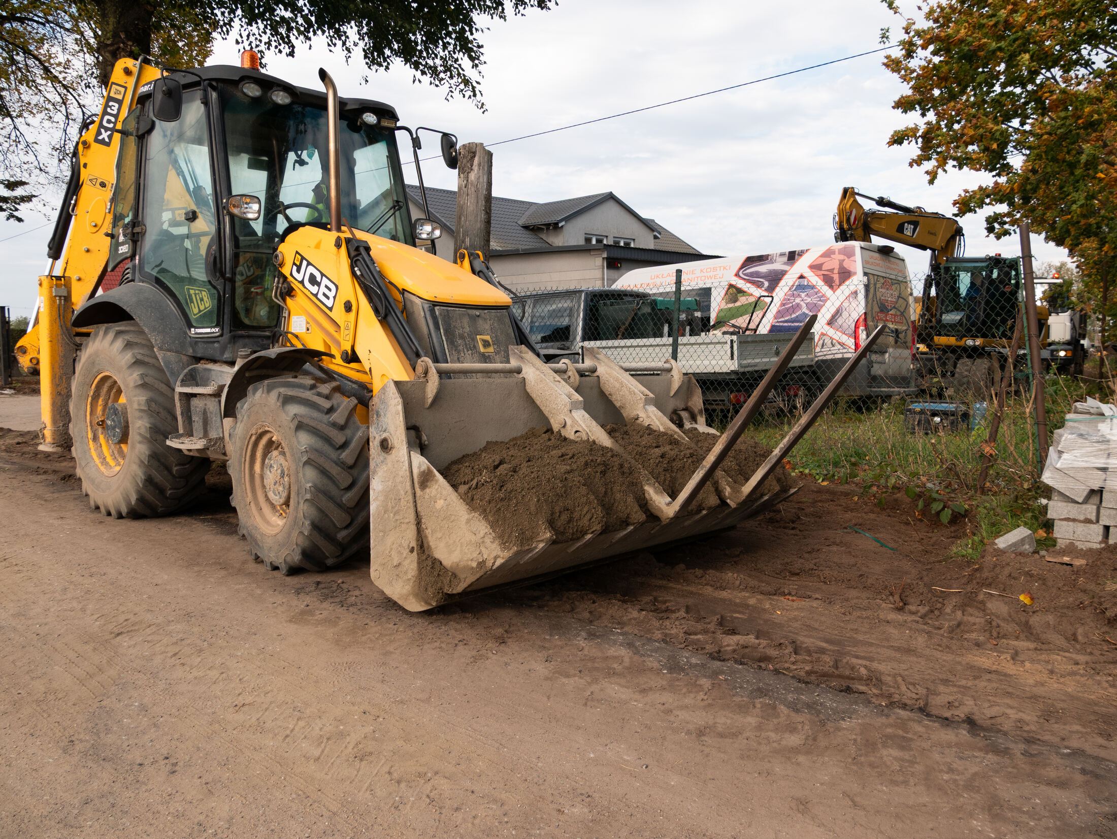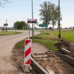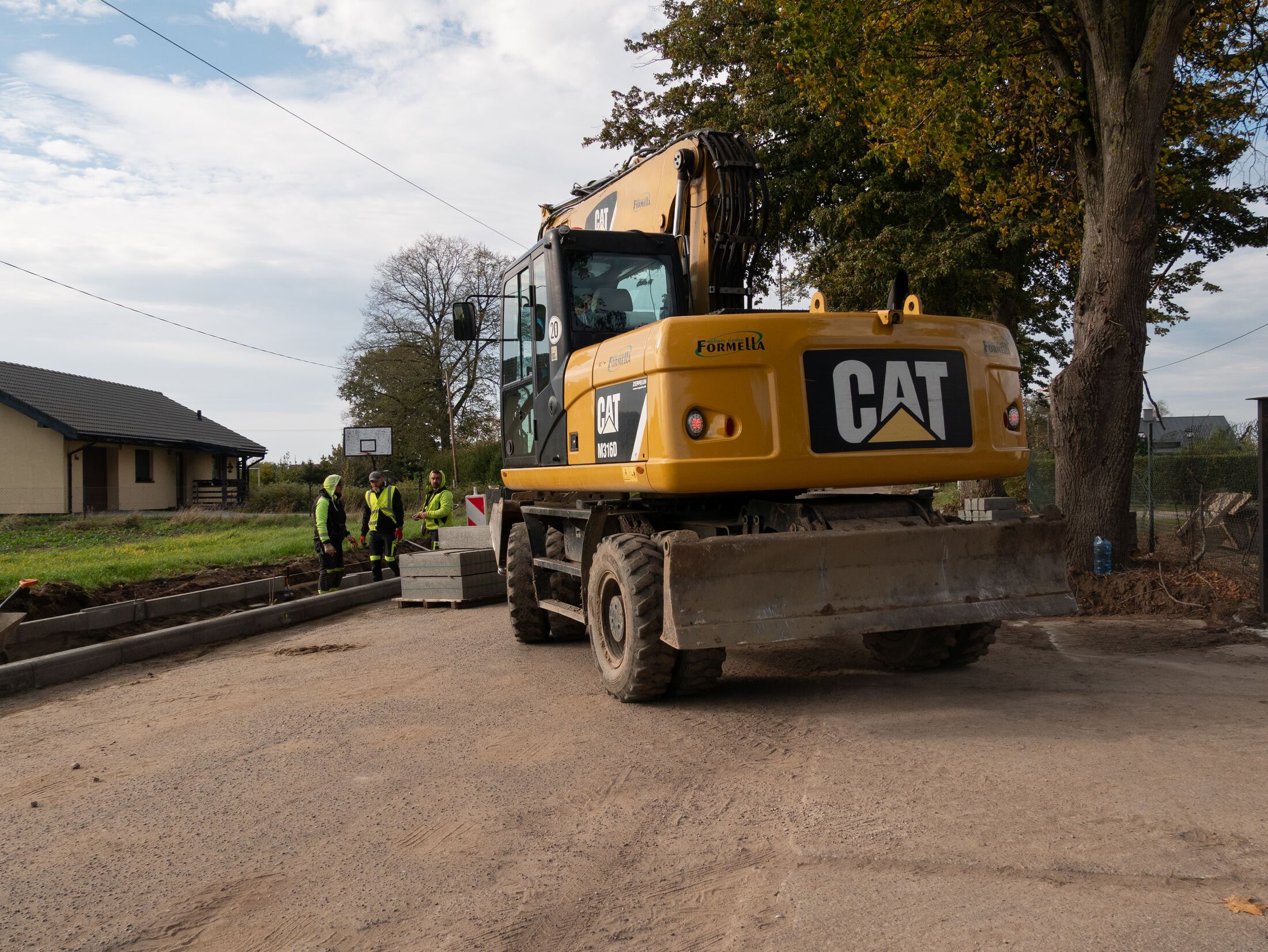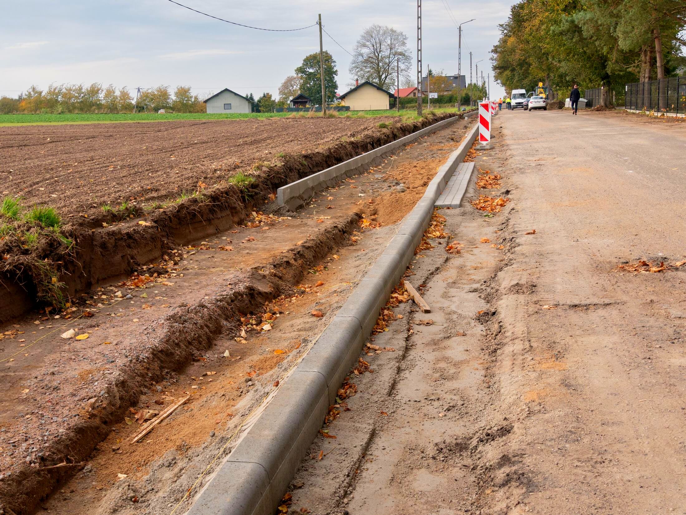 Zakres robót zakłada przebudowę chodników w miejscowości Gęś, wzmocnienie i poszerzenie istniejącej nawierzchni bitumicznej i wykonanie poboczy. To już się dzieje. Na drodze pracuje ciężki sprzęt oraz drogowcy, wytyczający linię poboczy i układający krawężniki pod przyszłe chodniki.