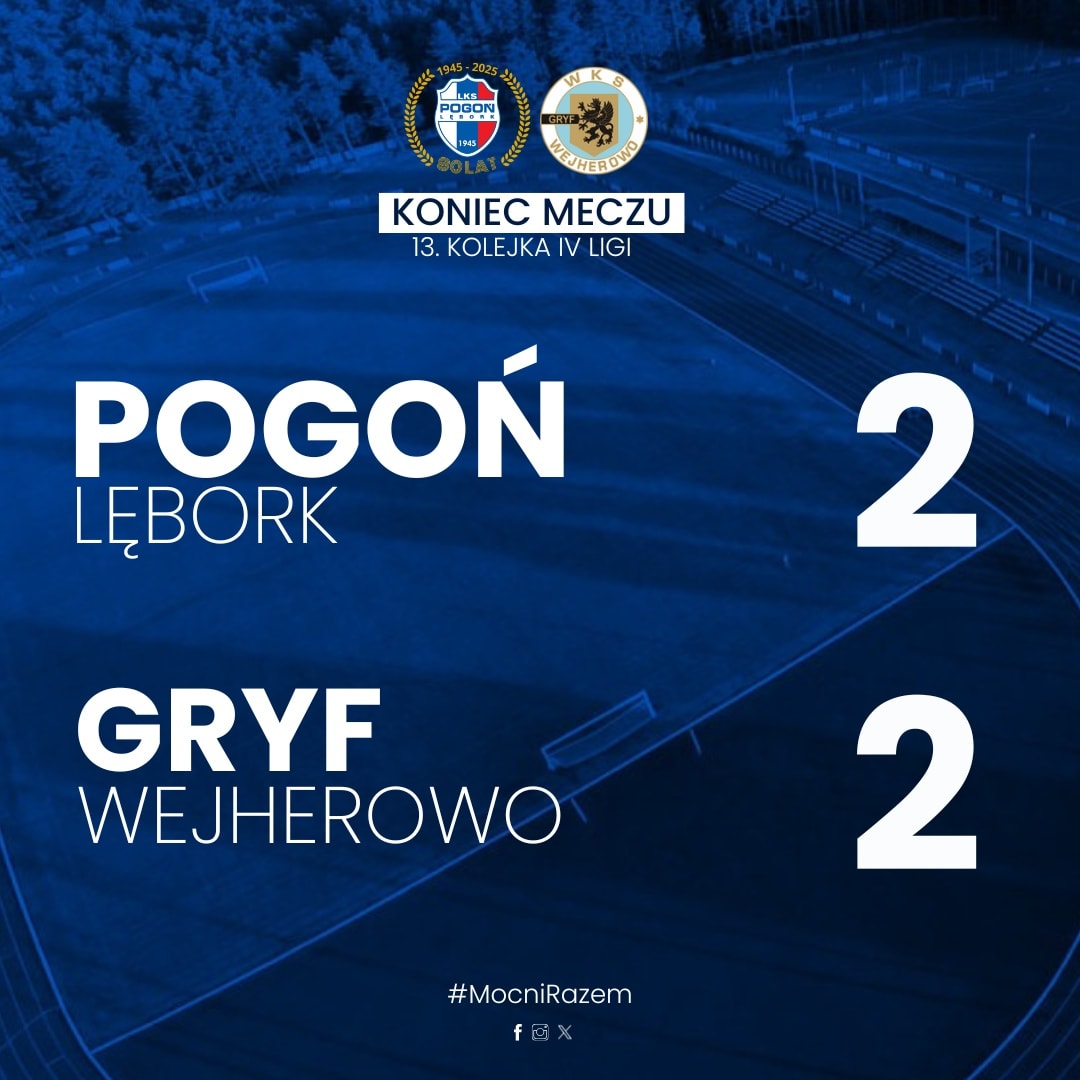 Piłkarze Pogoni Lębork zremisowali w sobotę, 25 października, u siebie z Gryfem Wejherowo 2:2 w meczu 13. kolejki rundy jesiennej IV ligi sezonu 2025/2026. To trzeci remis lęborczan w tym sezonie.