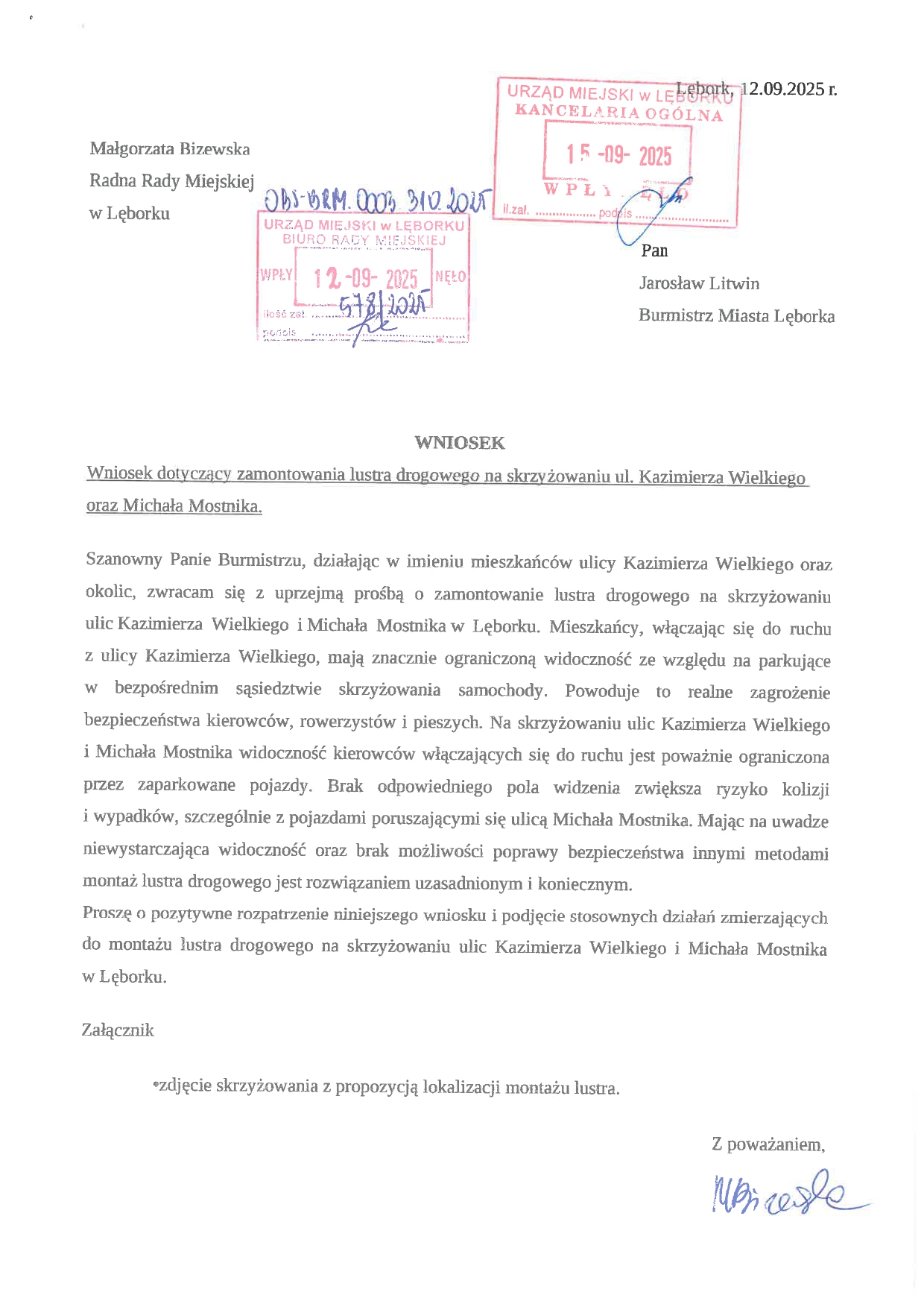 – Na skrzyżowaniu ulic Kazimierza Wielkiego i Michała Mostnika widoczność kierowców włączających się do ruchu jest poważnie ograniczona przez zaparkowane pojazdy – informuje Małgorzata Bizewska, radna Rady Miejskiej w Lęborku. – Brak odpowiedniego pola widzenia zwiększa ryzyko kolizji i wypadków, szczególnie z pojazdami poruszającymi się ulicą Michała Mostnika. Mając na uwadze niewystarczającą widoczność oraz brak możliwości poprawy bezpieczeństwa innymi metodami, montaż lustra drogowego jest rozwiązaniem uzasadnionym i koniecznym.