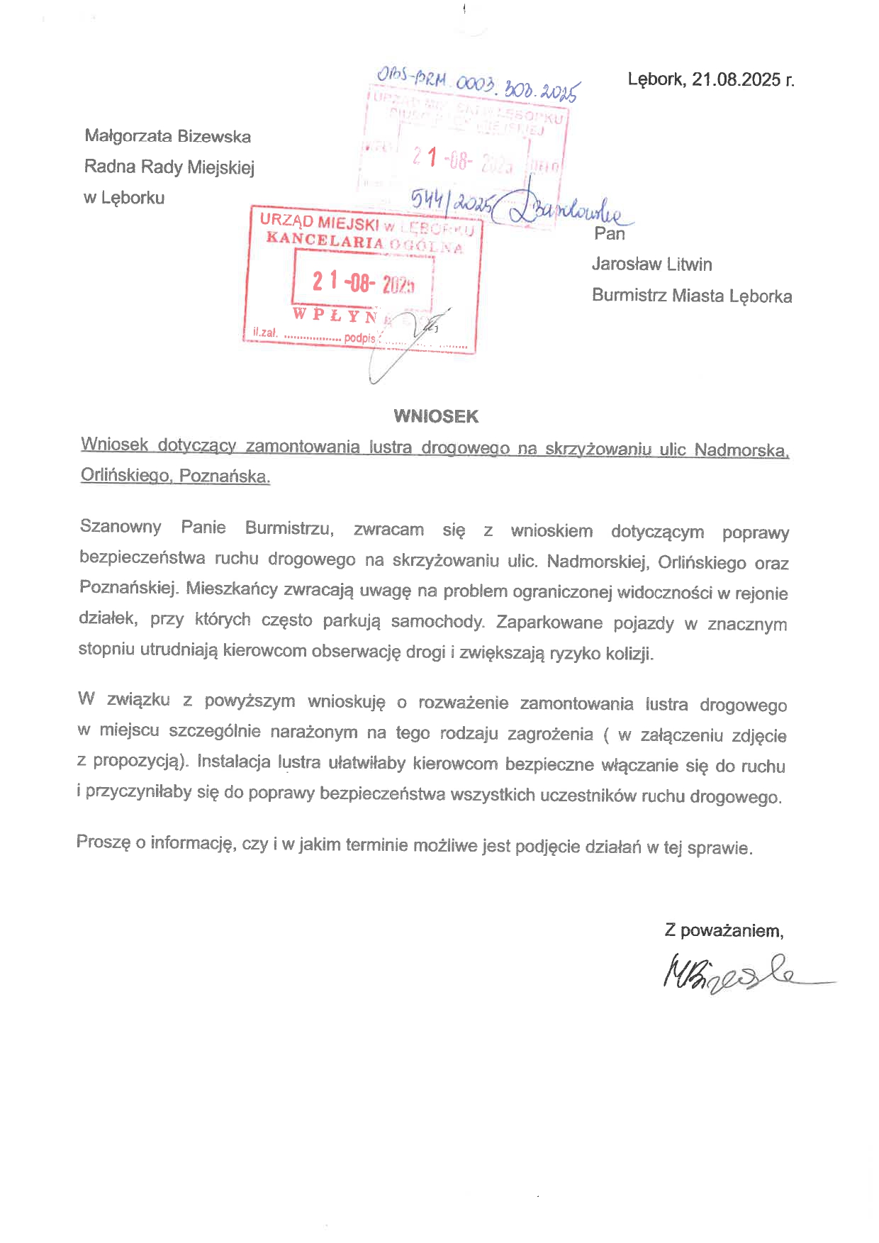 – Wnioskuję o rozważenie zamontowania lustra drogowego w miejscu szczególnie narażonym na tego typu rodzaje zagrożenia – mówi Małgorzata Bizewska. – Instalacja lustra ułatwiłaby kierowcom bezpieczne włączenie się do ruchu i przyczyniłaby się do poprawy bezpieczeństwa wszystkich uczestników ruchu drogowego.