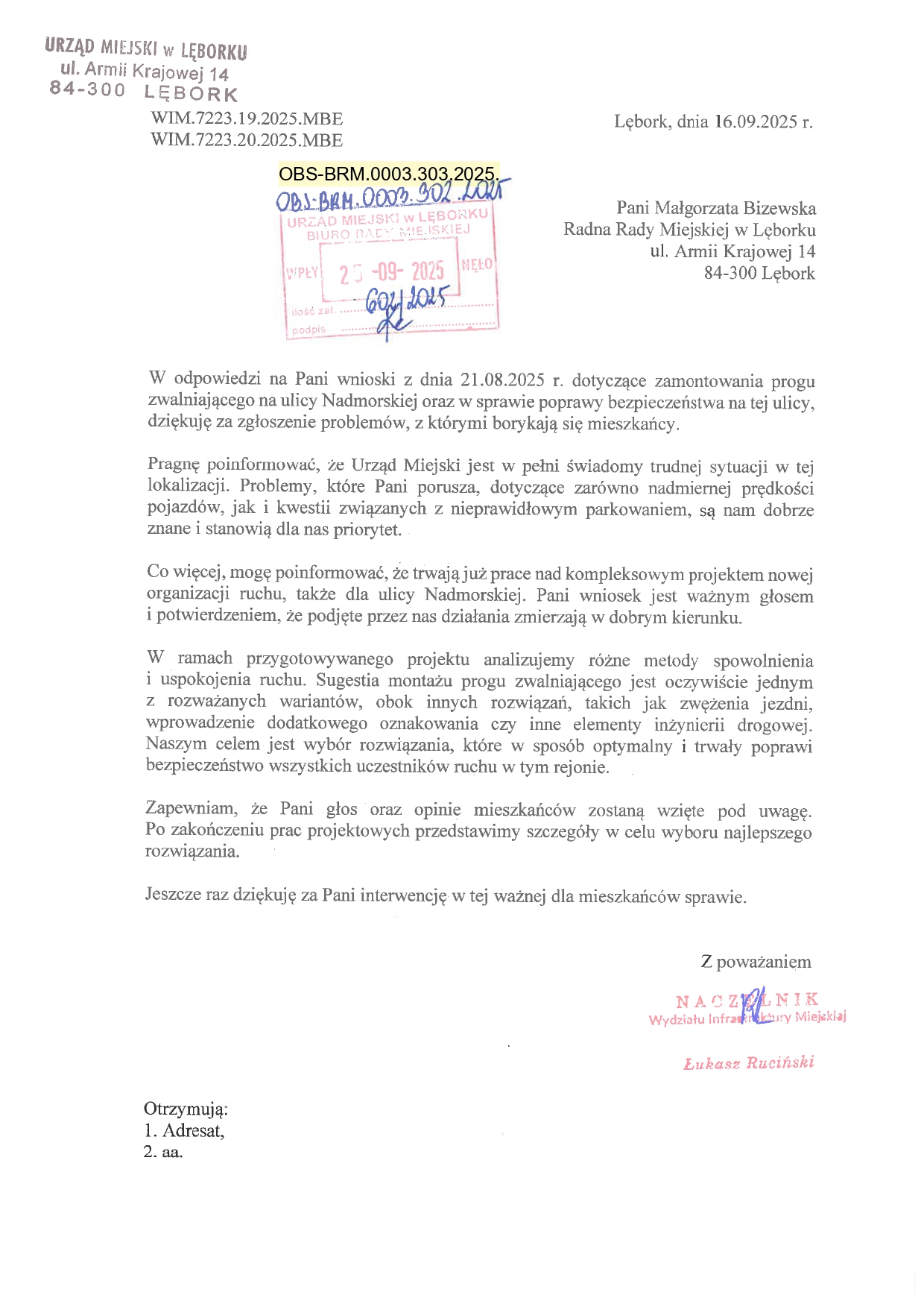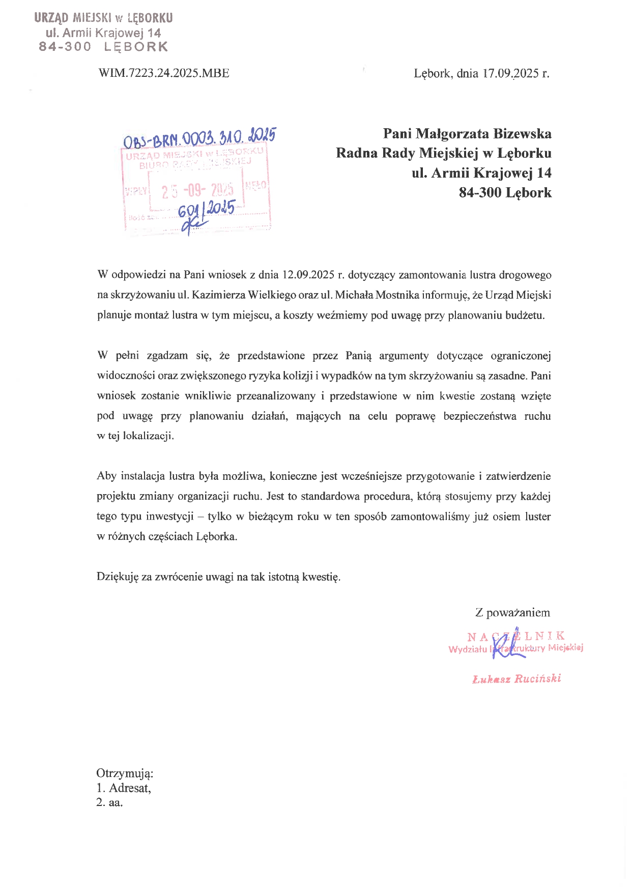 Radnej odpowiedział już Urząd Miejski w Lęborku. Urzędnicy potwierdzili, że przedstawione argumenty dotyczące ograniczonej widoczności oraz zwiększonego ryzyka kolizji i wypadków na tym skrzyżowaniu są zasadne. Zapewniono, że wniosek radnej będzie wnikliwie przeanalizowany, a przedstawione w nim kwestie zostaną wzięte pod uwagę przy planowaniu działań mających na celu poprawę bezpieczeństwa ruchu w tej lokalizacji.
