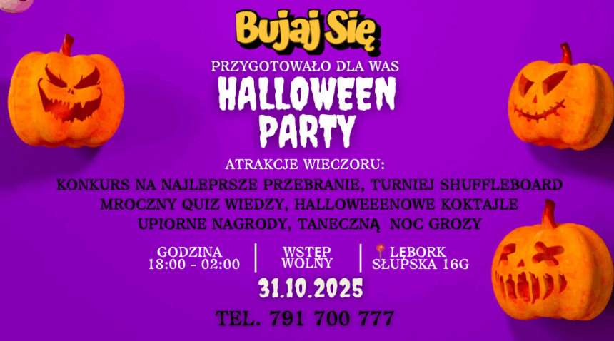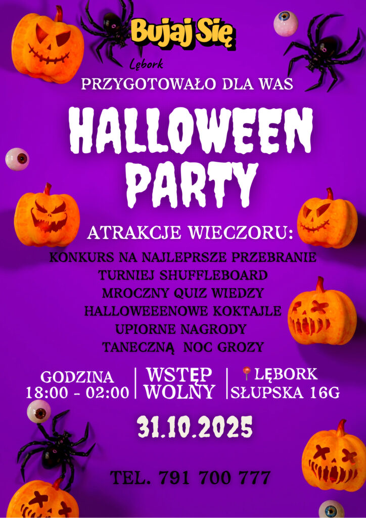 Już jutro (31.10) Lębork opanuje halloweenowa gorączka! Bujaj Się Lębork zaprasza wszystkich miłośników dobrej zabawy na wyjątkową imprezę, która połączy śmiech, muzykę, rywalizację i oczywiście – halloweenowy klimat