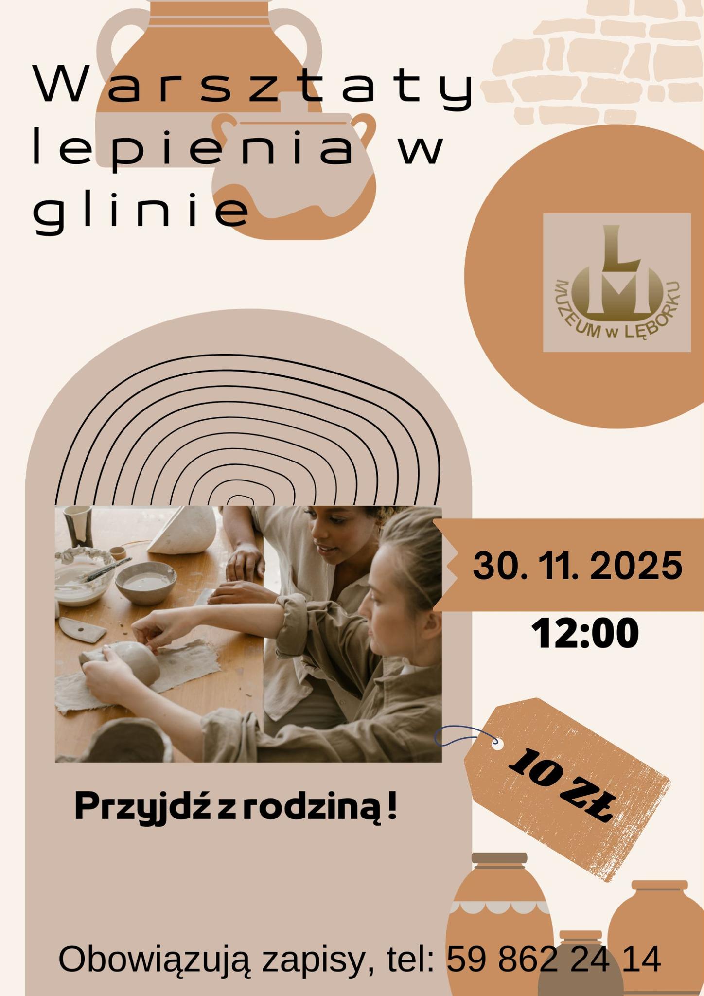 - Warsztaty lepienia w glinie w Muzeum w Lęborku. Początek o godz. 12:00. Koszt uczestnictwa: 10 zł. Zapisy pod nr. tel.: 59 862 24 14.