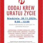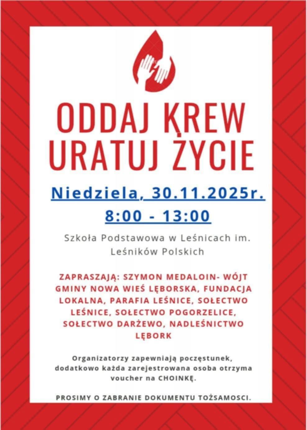 - Oddaj krew – uratuj życie. Szkoła Podstawowa w Leśnicach w godz. 8:00-13:00. Organizatorzy zapewniają poczęstunek, a każda zarejestrowana osoba dostanie voucher na choinkę.