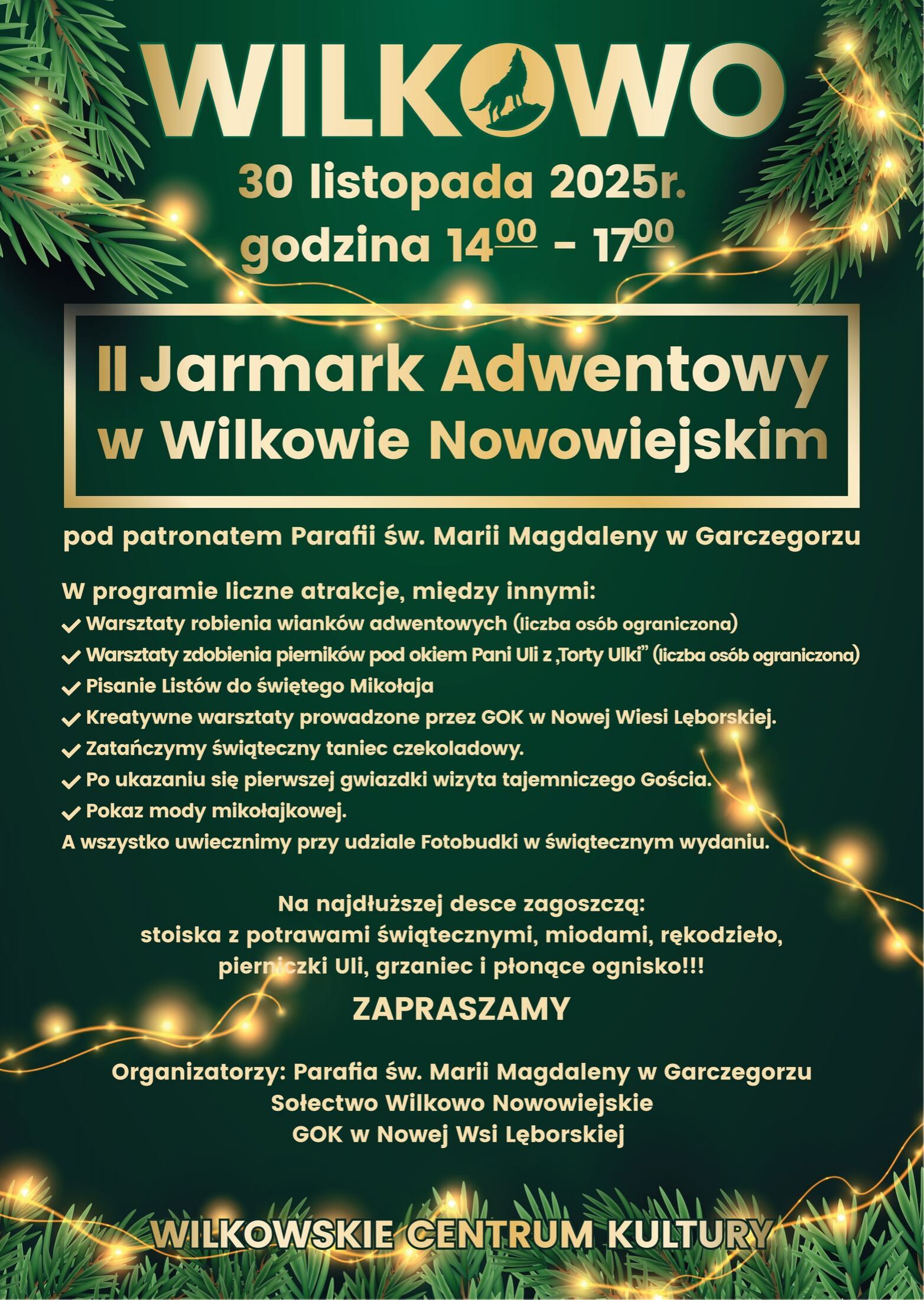 - II Jarmark Adwentowy w Wilkowie Nowowiejskim w godz. 14:00-17:00. Szczegółowy program znajduje się na plakacie.