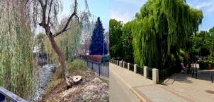 Wierzba rosnąca na skarpie przy rzece Łebie od strony ul. Armii Krajowej w Lęborku została wycięta. Według Wód Polskich drzewo było uschnięte oraz zagrażało bezpieczeństwu pieszym i rowerzystom.