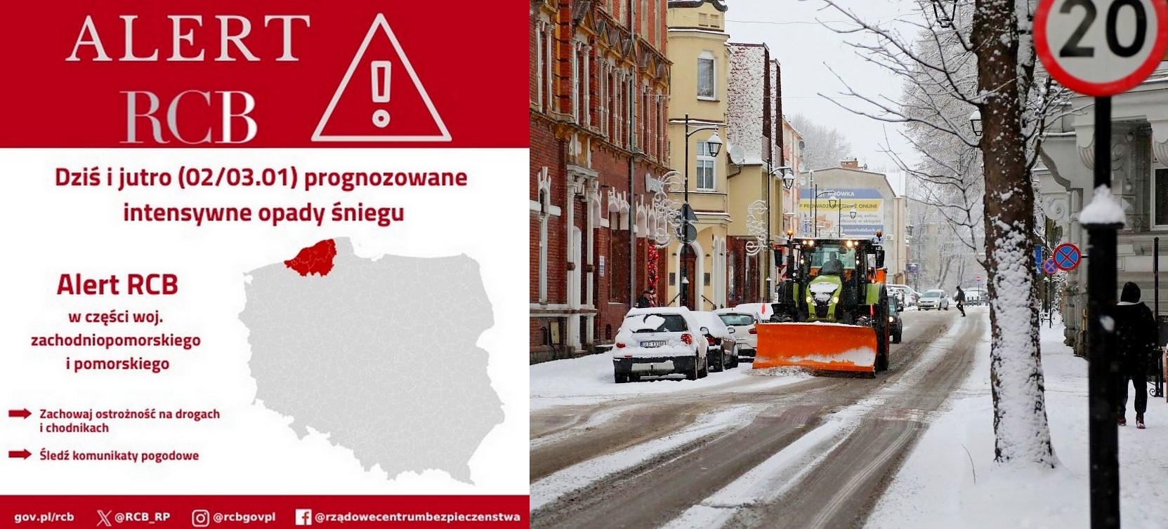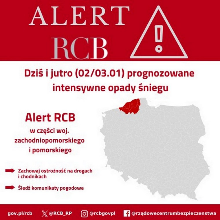 Rządowe Centrum Bezpieczeństwa wydało alert dla części województwa pomorskiego i zachodniopomorskiego dotyczący prognozowanych intensywnych opadów śniegu. Ostrzeżenie obowiązuje w piątek i sobotę, 2 i 3 stycznia.