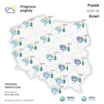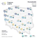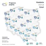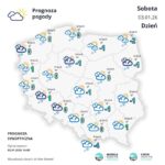 Po południu i wieczorem zachmurzenie duże lub całkowite. Przelotne opady śniegu i deszczu ze śniegiem, nad morzem również deszczu. Podczas opadów śniegu możliwe ograniczenie widzialność do około 500 m. Prognozowany przyrost pokrywy śnieżnej lokalnie o około 5 cm. W pasie nadmorskim suma opadów do około 10 mm. Miejscami oblodzenie nawierzchni dróg. Temperatura maksymalna od 0°C do 2°C. Wiatr umiarkowany i dość silny, w porywach do 55 km/h, nad morzem dość silny i silny, do 45 km/h, w porywach do 70 km/h, stopniowo słabnący, południowo-zachodni. Możliwe zamiecie i zawieje śnieżne.