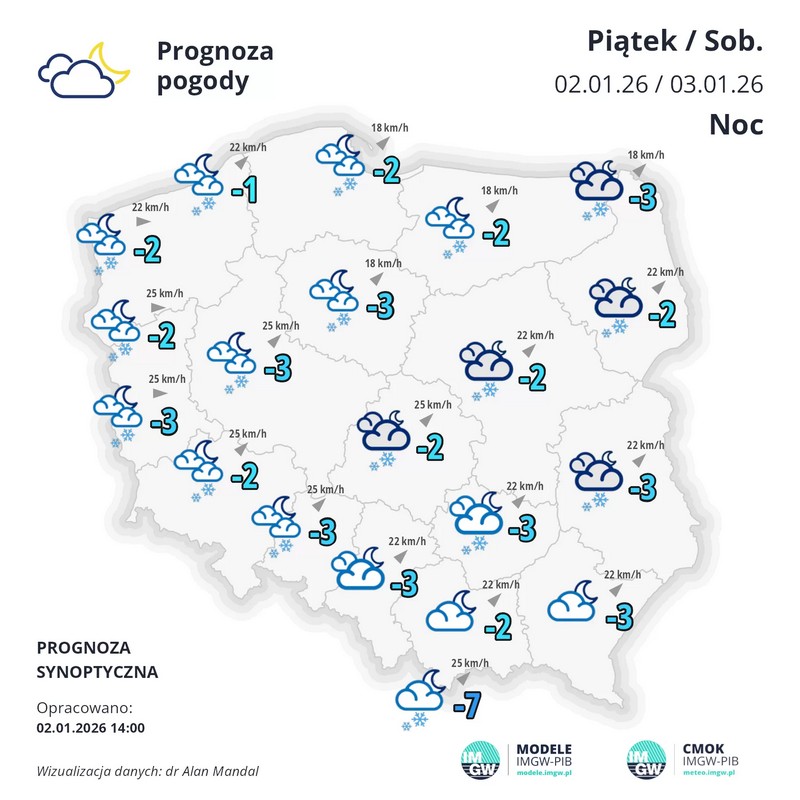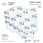 W nocy zachmurzenie duże lub całkowite. Przelotne opady śniegu, lokalnie również deszczu ze śniegiem. Opady lokalnie o natężeniu umiarkowanym, ograniczające widzialność do około 500 m. Prognozowany przyrost pokrywy śnieżnej od 5 cm do 10 cm, lokalnie 15 cm. Oblodzenie nawierzchni dróg. Temperatura minimalna od -4°C do -2°C, nad morzem około 0°C. Wiatr umiarkowany, porywisty, nad morzem dość silny i silny, do 45 km/h, w porywach do 65 km/h, z kierunków zachodnich. Możliwe zawieje i zamiecie śnieżne.