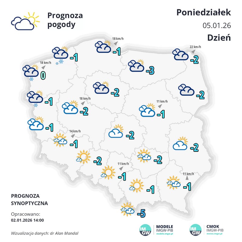 W dzień zachmurzenie duże. Przelotne opady śniegu, okresami o natężeniu umiarkowanym, ograniczające widzialność do około 500 m. Prognozowany przyrost pokrywy śnieżnej od 5 cm do 10 cm, lokalnie 20 cm. Temperatura maksymalna od -2°C do 0°C. Wiatr umiarkowany i dość silny, w porywach do 60 km/h, nad morzem okresami silny, do 45 km/h, w porywach do 70 km/h, południowo-zachodni i zachodni. Miejscami zawieje i zamiecie śnieżne.