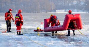 Na zalodzonym Jeziorze Lubowidzkim odbyły się ćwiczenia z ratownictwa lodowego, w których wzięli udział strażacy z powiatu lęborskiego. Doskonalono m.in. techniki poruszania się po lodzie oraz podejmowania poszkodowanych z przerębli z wykorzystaniem sprzętu ratowniczego i pływającego.