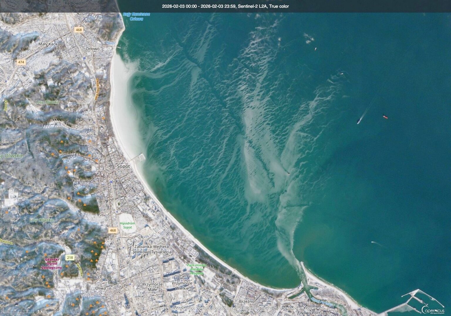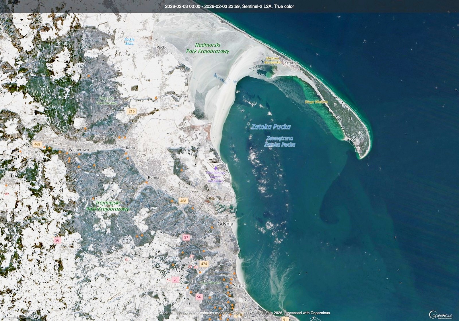 Spektakularne zdjęcia z satelity Sentinel-2 z 3 lutego 2026 r. pokazują, jak wyjątkowo zamarzła wewnętrzna Zatoka Pucka.