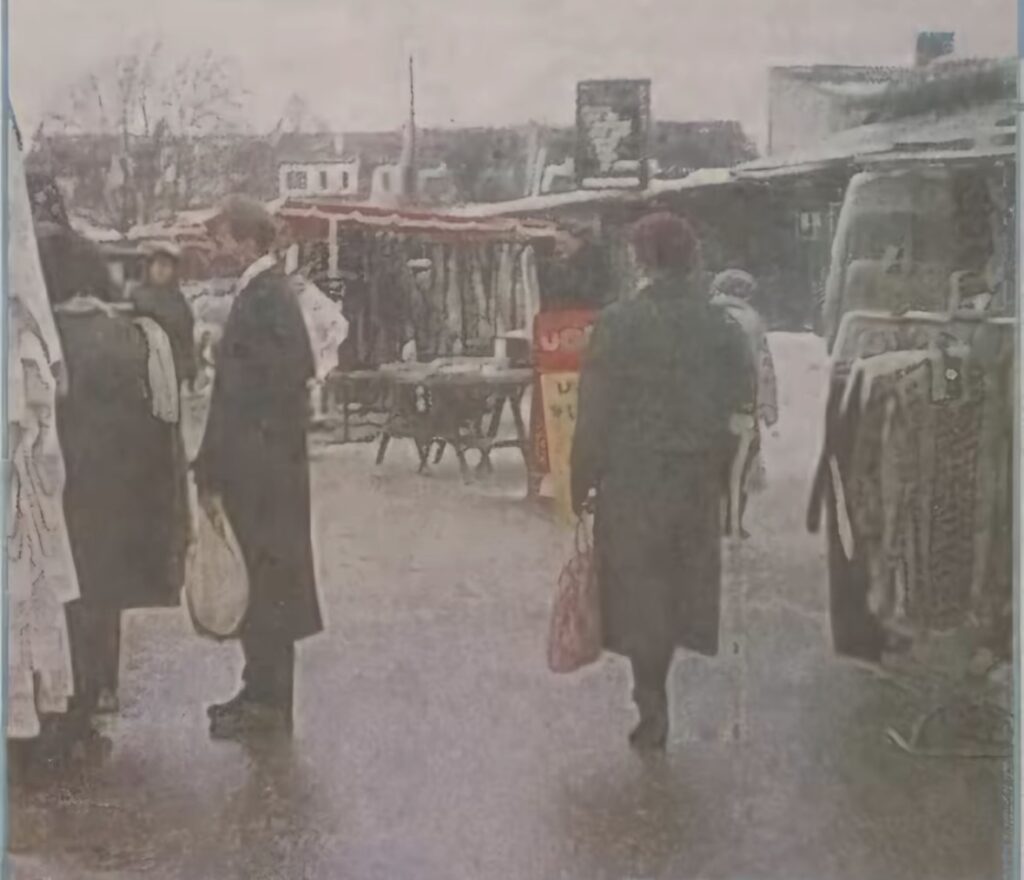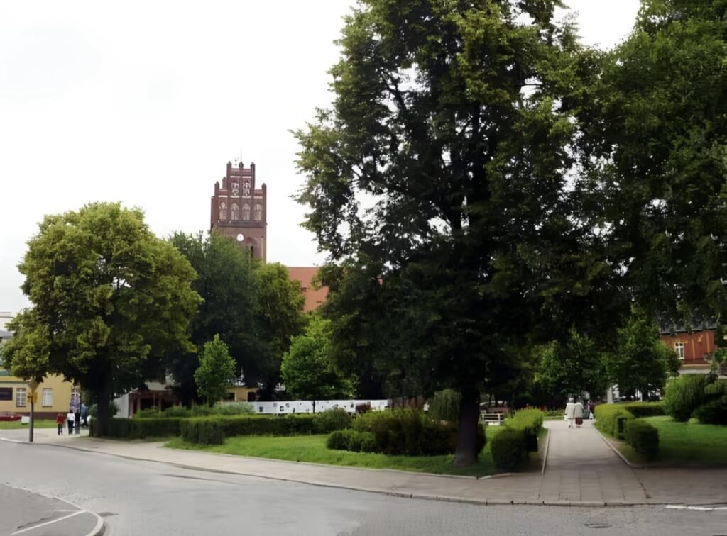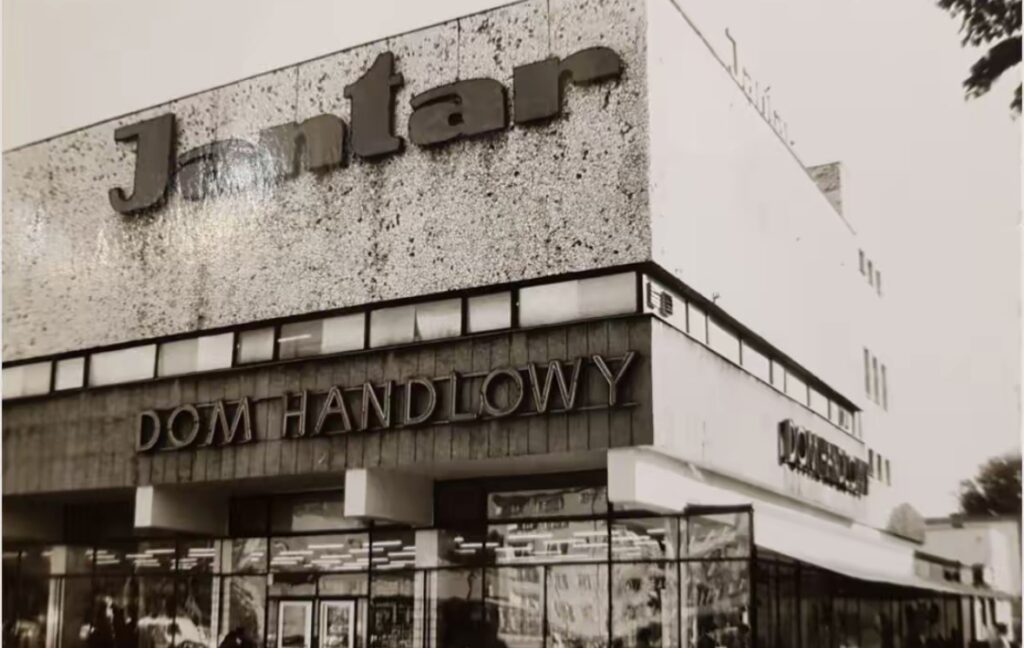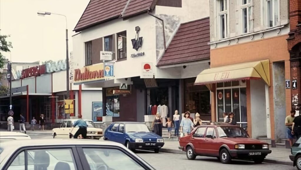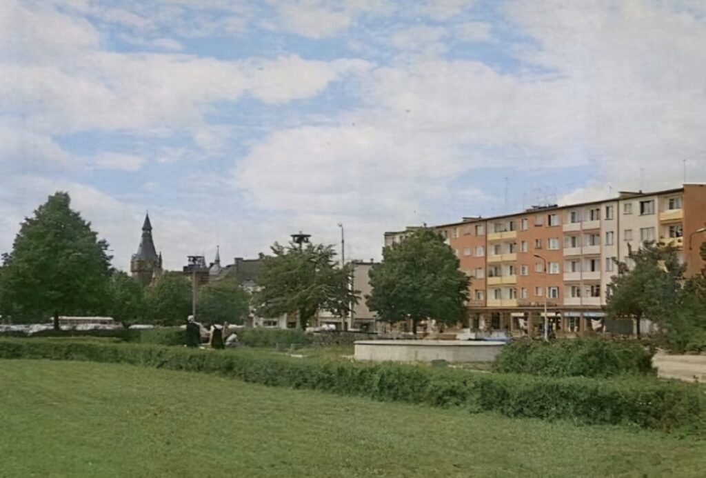 Fotografie pokazują także Dom Handlowy Jantar, który przez lata był ważnym punktem zakupowym miasta, oraz zielony skwer przed kościołem — spokojną przestrzeń odpoczynku i spotkań. Całość dopełnia tętniąca życiem Staromiejska, pełna przechodniów, sklepów i codziennego ruchu.
