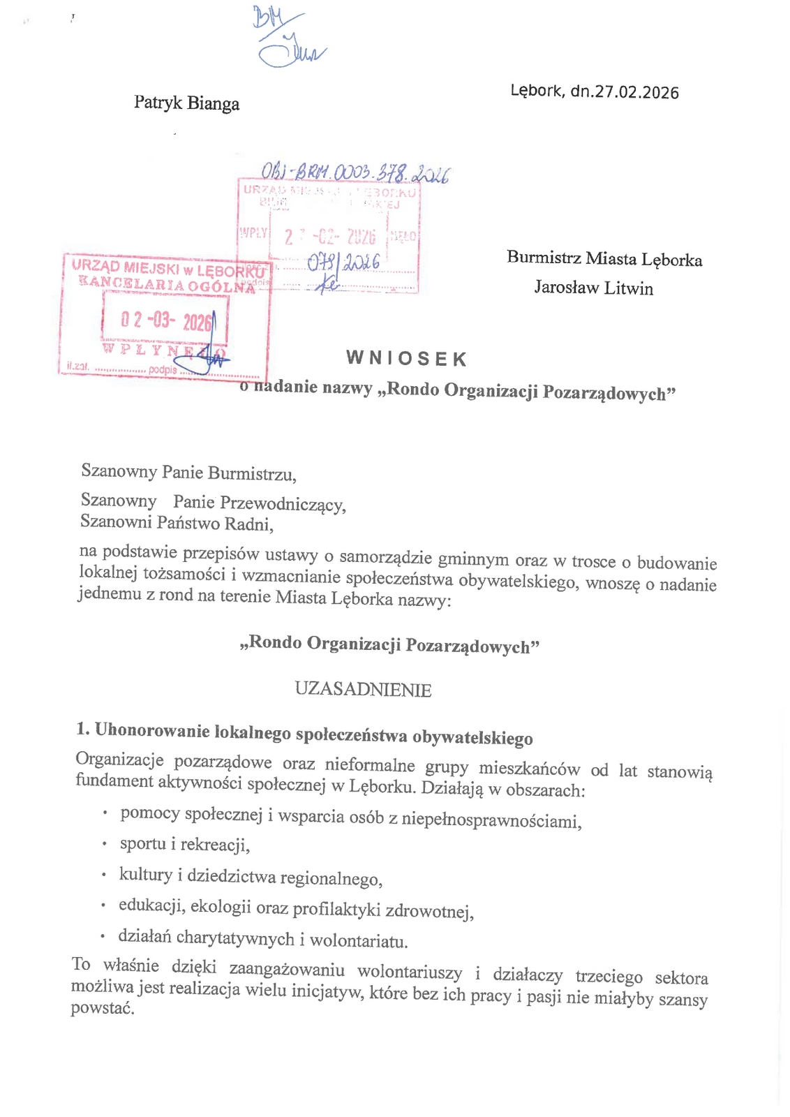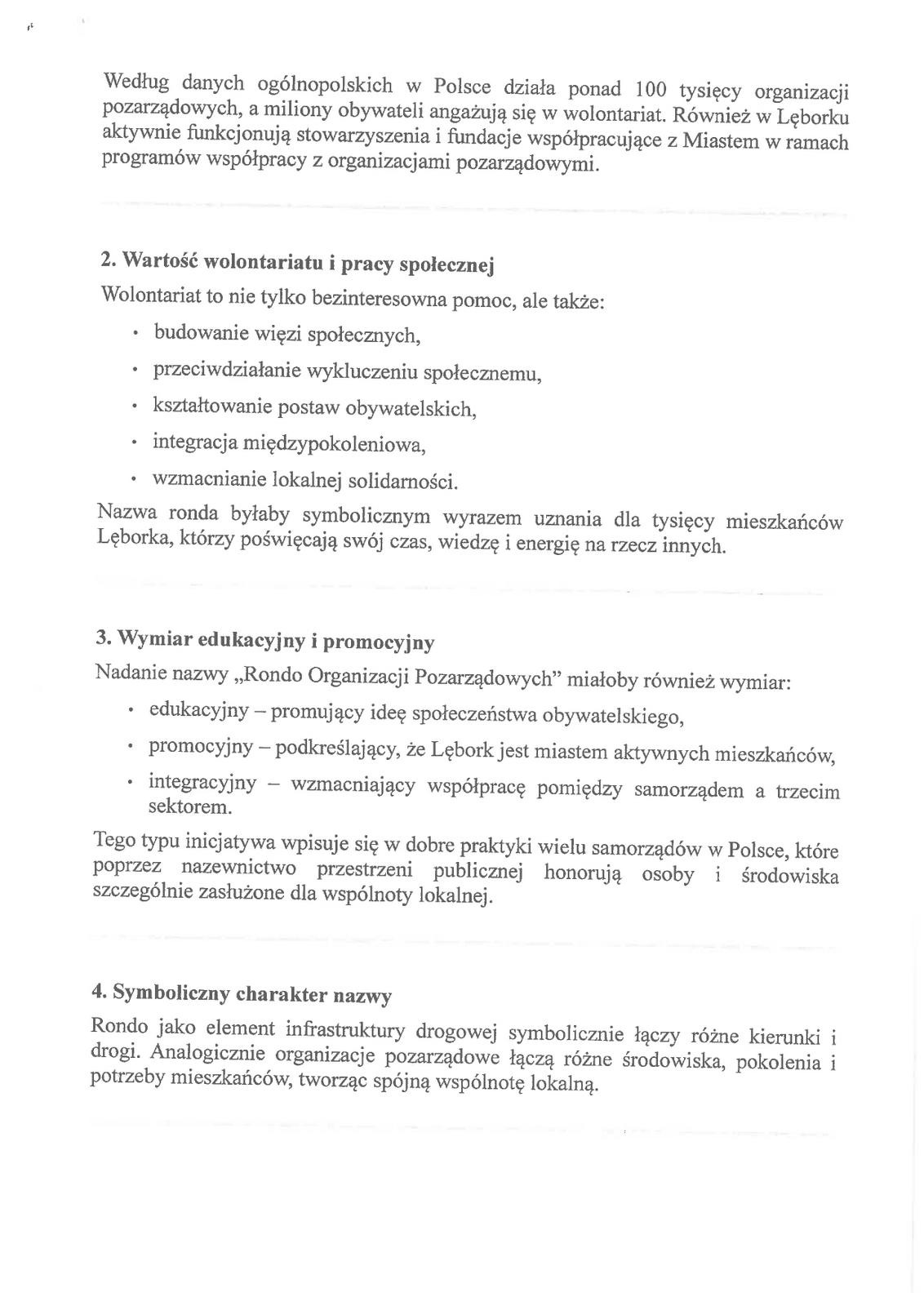 W dalszej części swojej wypowiedzi radny Bianga uzasadnił swój wniosek. Wymienił cztery główne punkty. Są nimi: uhonorowanie lokalnego społeczeństwa obywatelskiego – organizacje pozarządowe oraz nieformalne grupy mieszkańców od lat stanowią fundament aktywności społecznej w Lęborku. To także podkreślenie wartości wolontariatu i pracy społecznej – nazwa ronda byłaby symbolicznym wyrazem uznania dla tysięcy mieszkańców Lęborka, którzy poświęcają swój czas, wiedzę i energię na rzecz innych. Radny podkreślił także wymiar edukacyjny i promocyjny oraz symboliczny charakter nazwy.