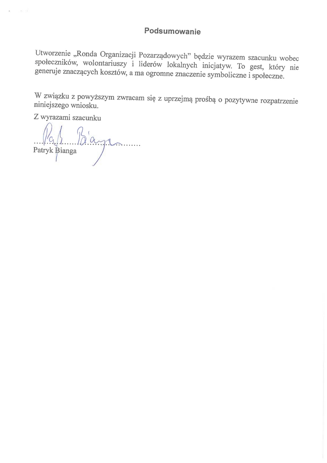 – Utworzenie ronda Organizacji Pozarządowych będzie wyrazem szacunku wobec społeczeństwa, wolontariuszy i liderów inicjatyw. To gest, który nie generuje znaczących kosztów, a ma ogromne znaczenie symboliczne i społeczne – podsumował swoją wypowiedź Patryk Bianga.