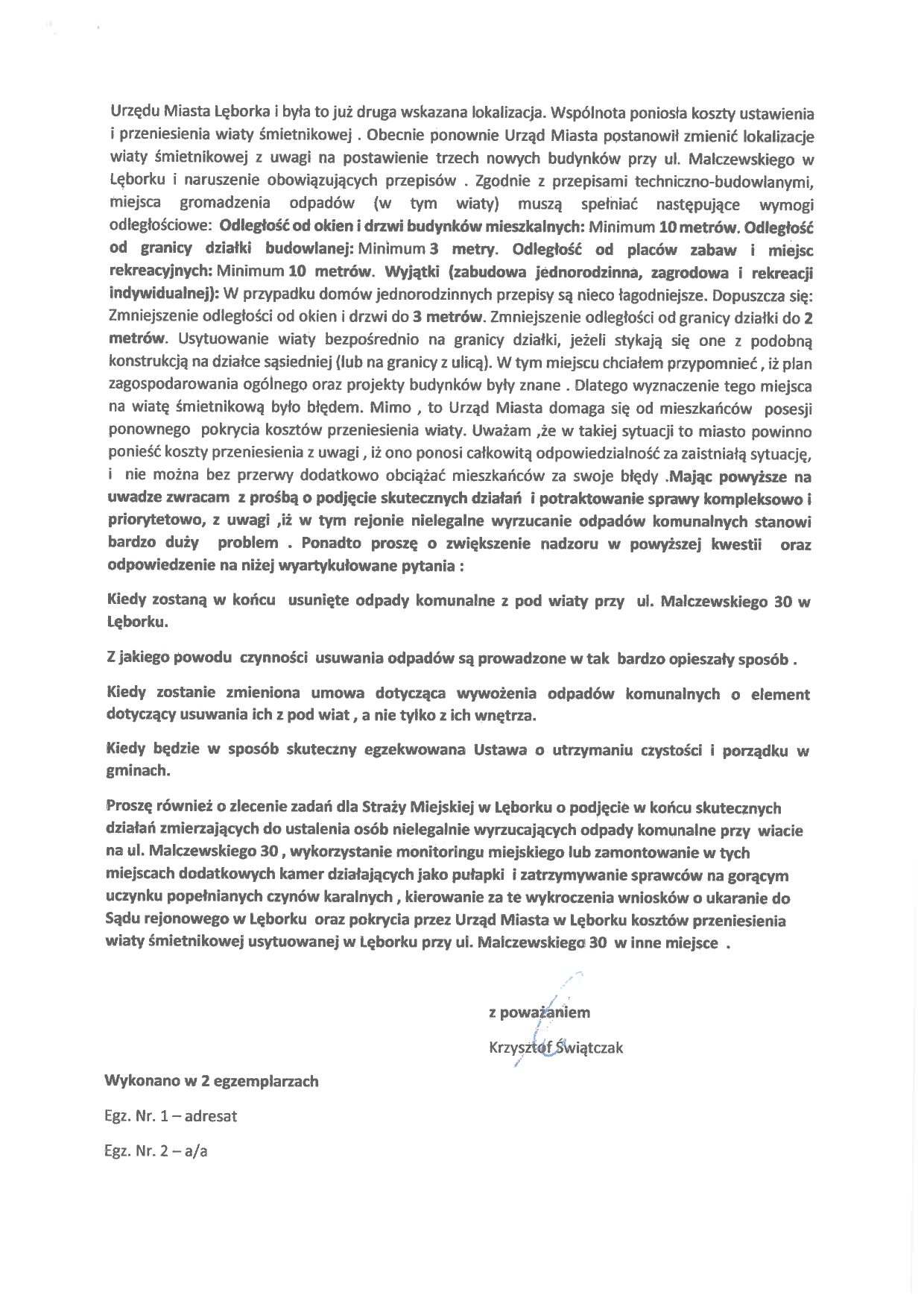 Radny zaapelował także o zlecenie zadań dla Staży Miejskiej w Lęborku i podjęcie skutecznych działań zmierzających do ustalenia osób nielegalnie wyrzucających odpady komunalne przy wiacie śmietnikowej przy ul. Malczewskiego 30. Domaga się wykorzystania monitoringu miejskiego lub zamontowanie w tych miejscach dodatkowych kamer działających jako pułapki i zatrzymywania sprawców na gorącym uczynku.