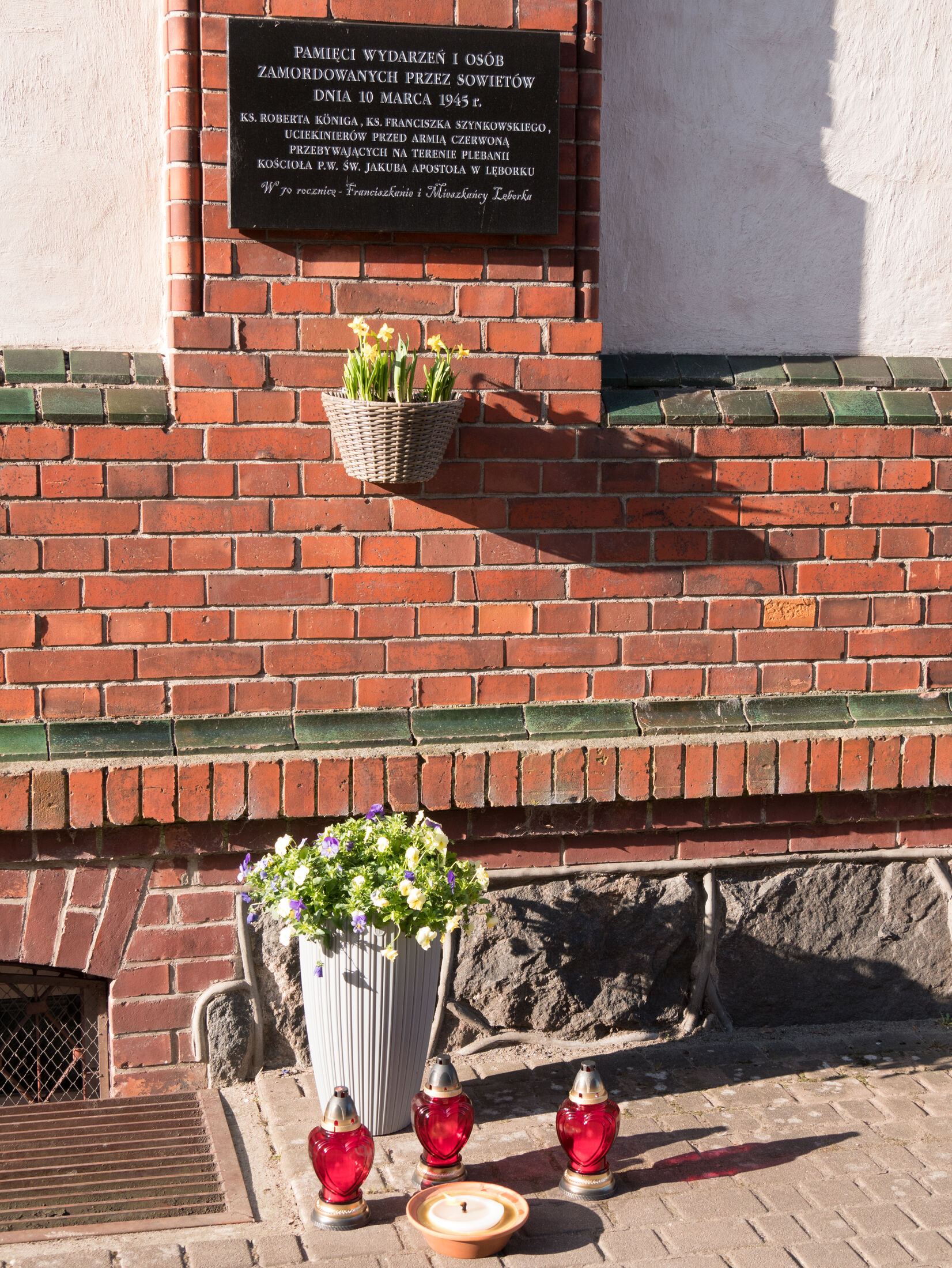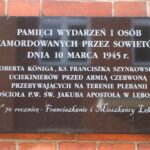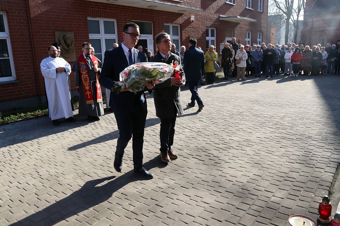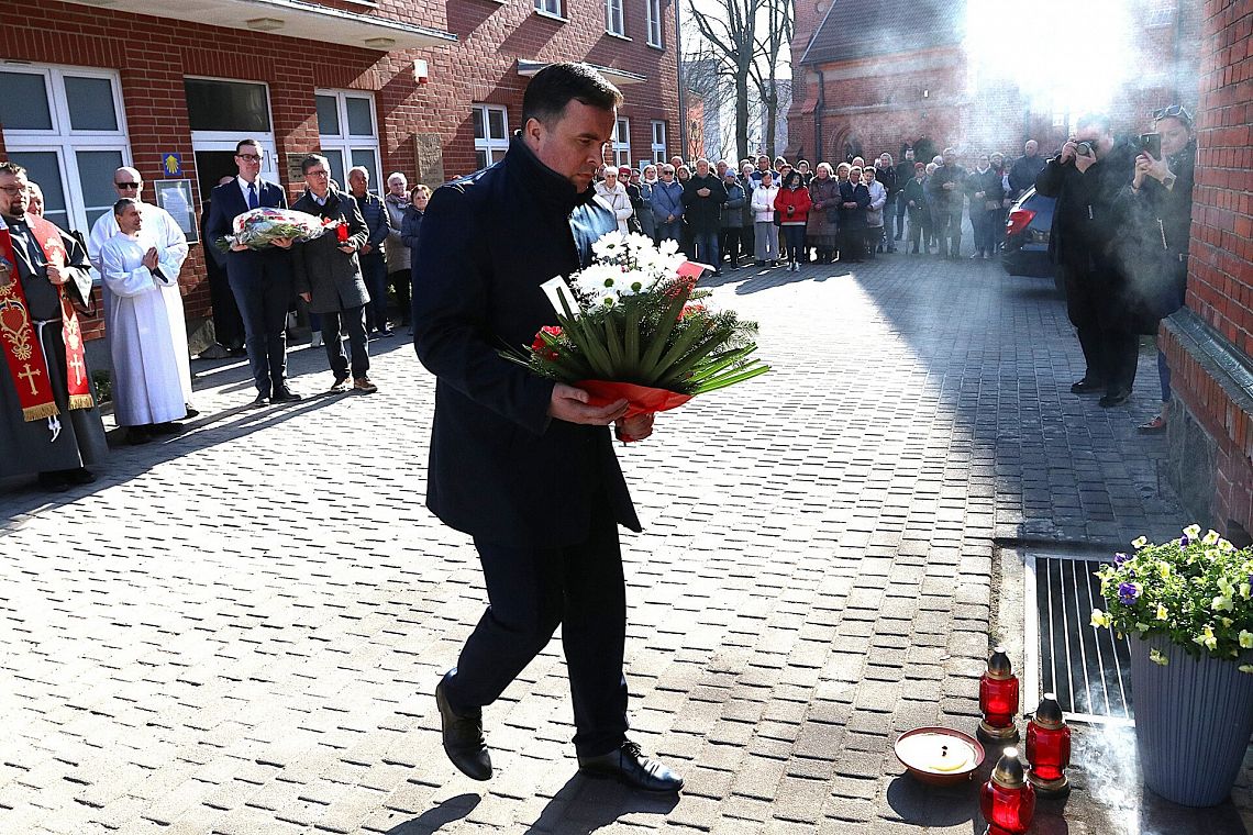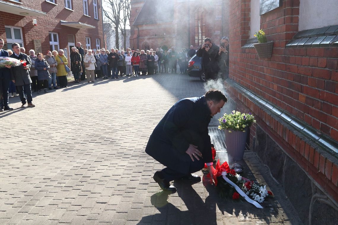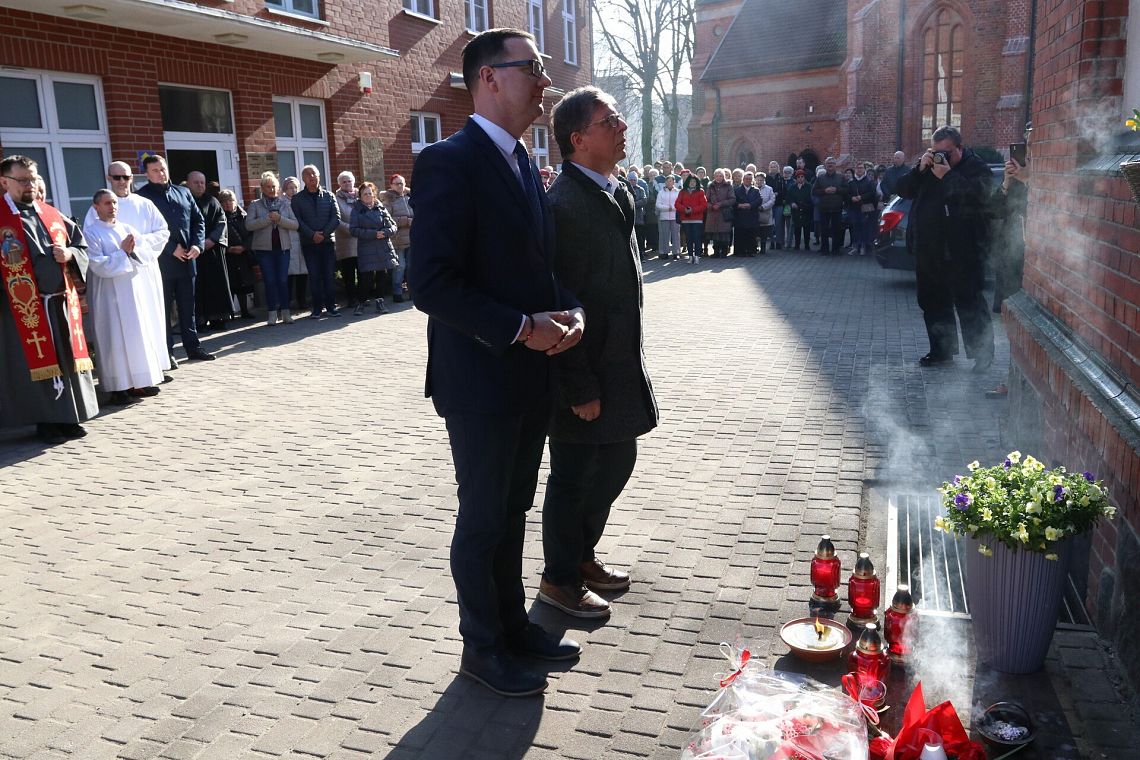 Po zakończeniu nabożeństwa uczestnicy uroczystości złożyli kwiaty oraz zapalili znicze pod tablicą pamiątkową wmurowaną w ścianę plebanii, ufundowaną w 70. rocznicę tamtych wydarzeń w 2015 roku. Widnieje na niej napis upamiętniający osoby zamordowane przez Sowietów 10 marca 1945 roku – ks. Roberta Königa, ks. Franciszka Szynkowskiego oraz uciekinierów przed Armią Czerwoną, którzy przebywali na terenie plebanii.