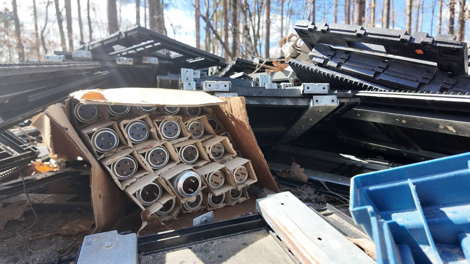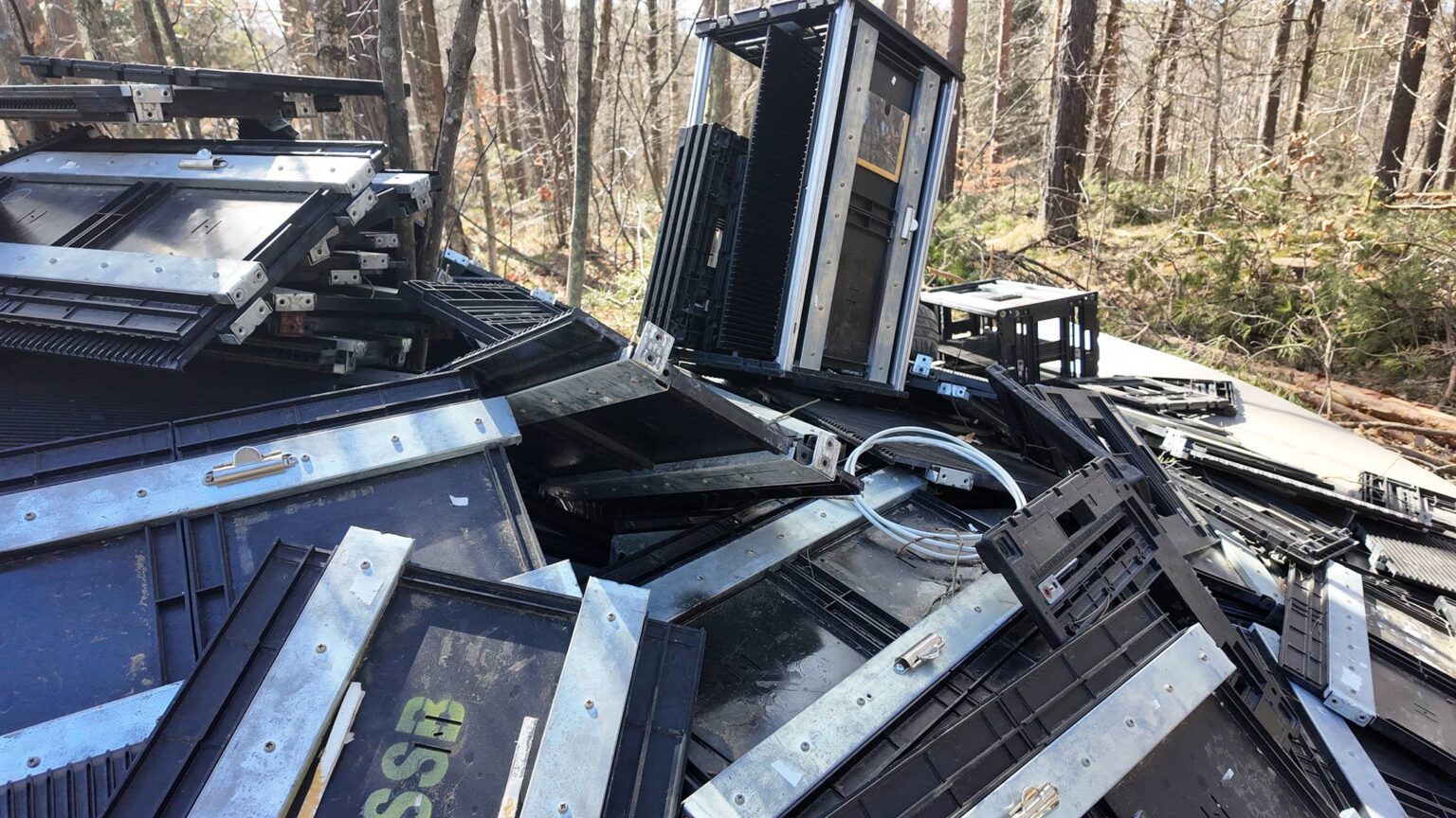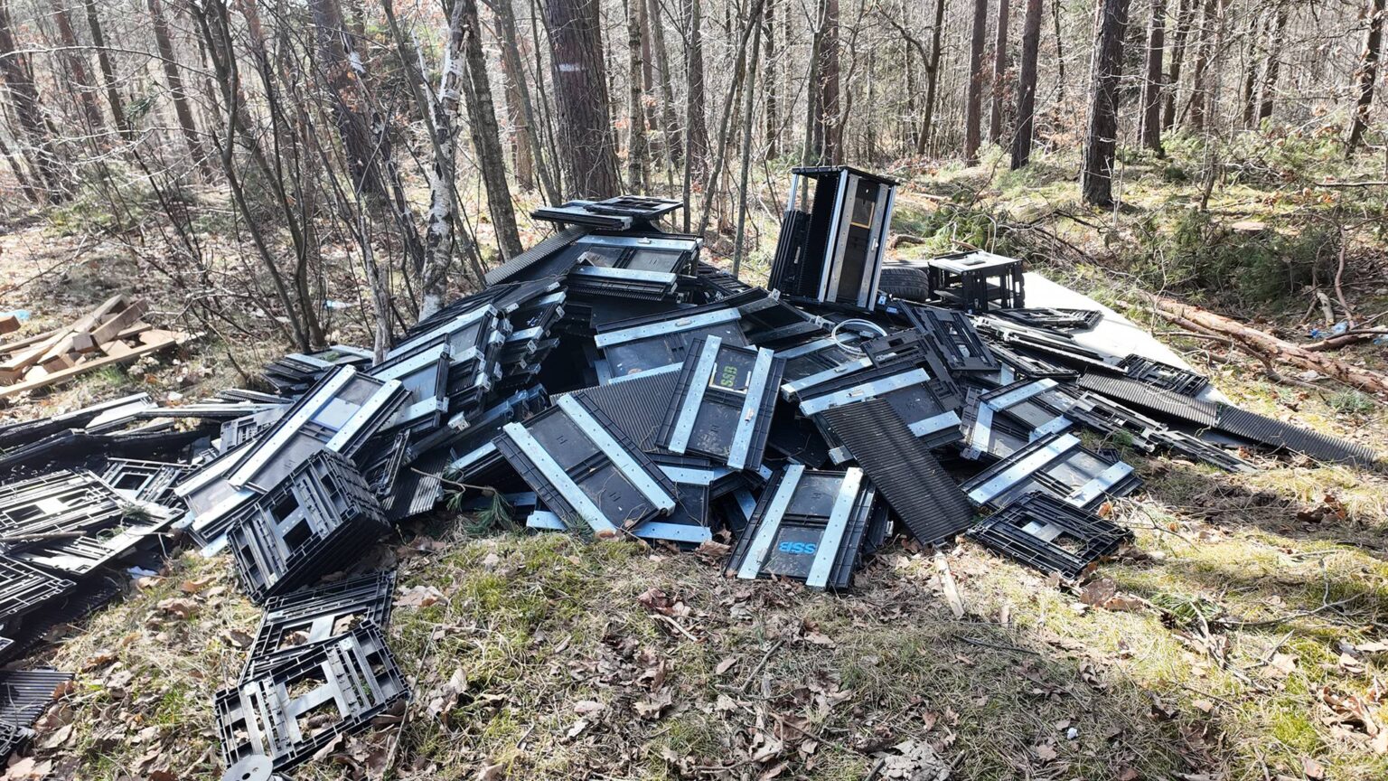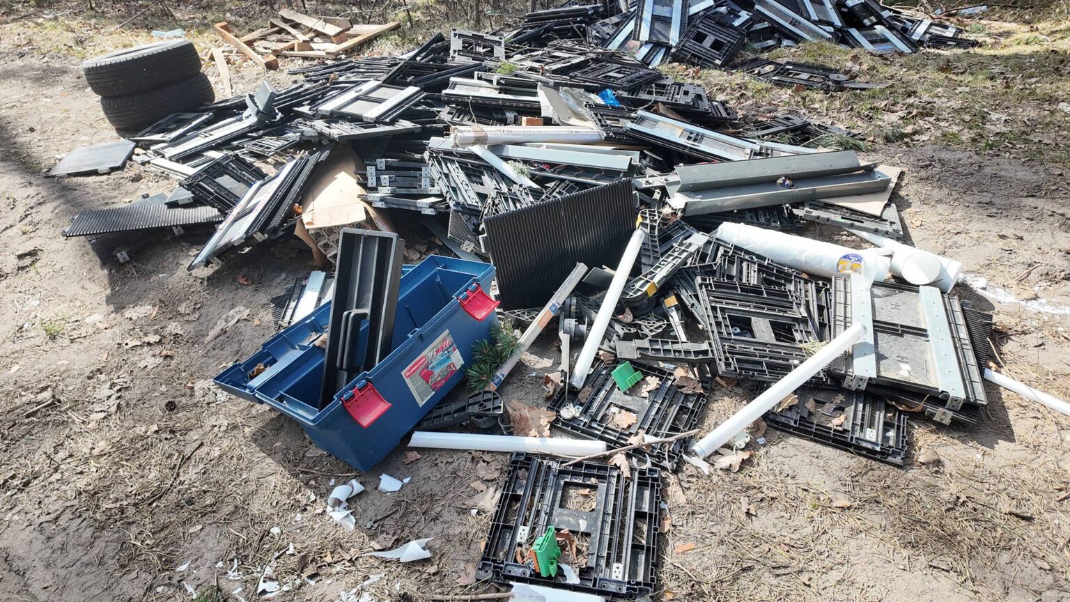 Na załączonych zdjęciach widać, że ktoś przywiózł i wyrzucił między drzewami dużą ilość specjalistycznych odpadów. Są tam plastikowe elementy, części techniczne, do tego opony i inne śmieci.