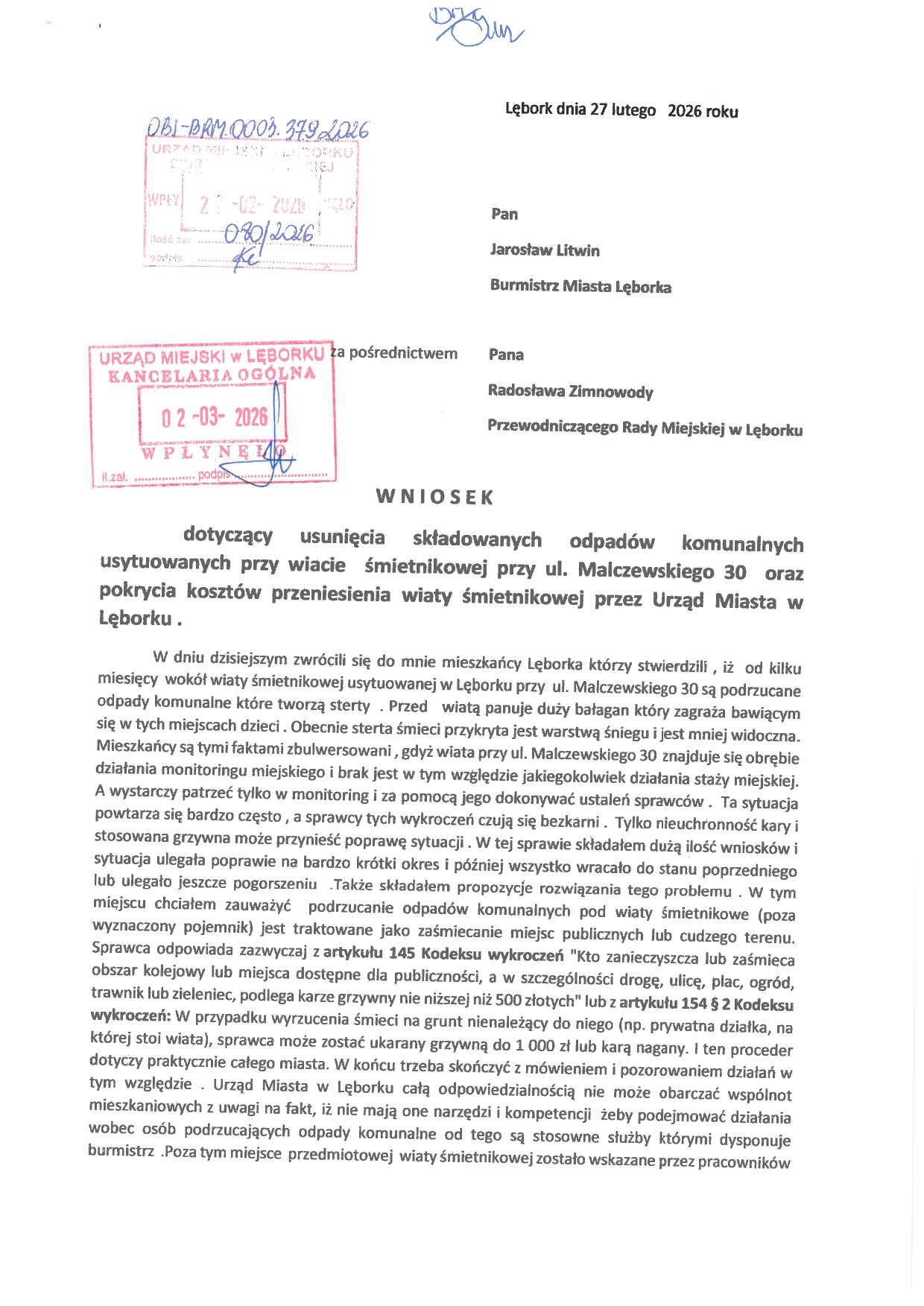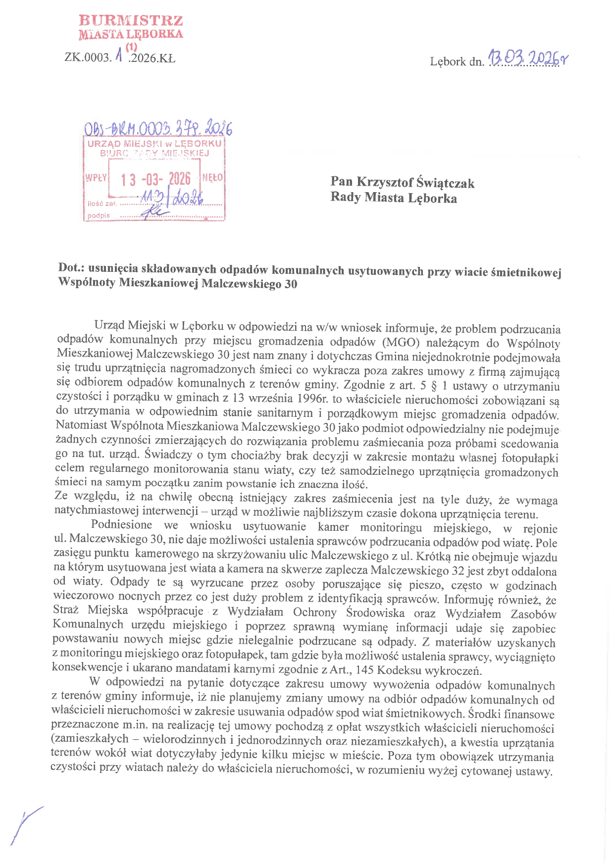 Radny zaapelował także o zlecenie zadań dla Staży Miejskiej w Lęborku i podjęcie skutecznych działań zmierzających do ustalenia osób nielegalnie wyrzucających odpady komunalne przy wiacie śmietnikowej przy ul. Malczewskiego 30. Domagał się też wykorzystania monitoringu miejskiego lub zamontowanie w tych miejscach dodatkowych kamer działających jako pułapki i zatrzymywania sprawców na gorącym uczynku.