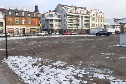 Niezabudowany teren przekształcony przez mieszkańców w błotnisty parking pomiędzy Placem Pokoju, „Biedronką”…