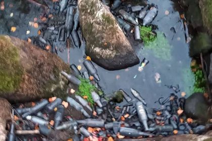 Dziesiątki pustych butelek i inne nieczystości na dnie rzeki Łeby w Lęborku