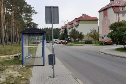 Na ul. Teligi wiata przystankowa i znak blokują chodnik