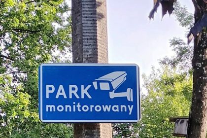 Tabliczka w Parku Michalskiego informuje, że park jest monitorowany a zatem potencjalni…