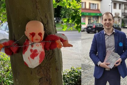Makabryczna lalka przy Galerii Delfino przypominała o Wołyniu
