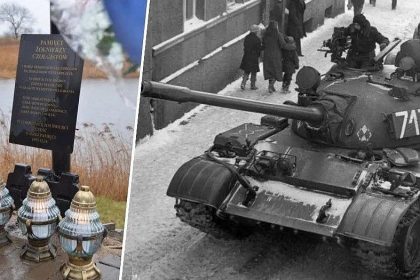 Kolumna czołgów prowadzona przez transporter opancerzony Skot zbliżała się do mostu na…