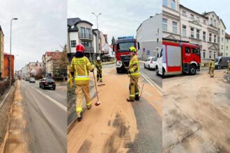 Strażacy walczyli z plamą oleju na Alei Wolności i ulicy Kossaka w Lęborku