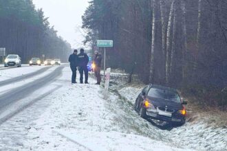 Niebezpiecznie na DW214. Kierowca BMW zakończył podróż w przydrożnym rowie