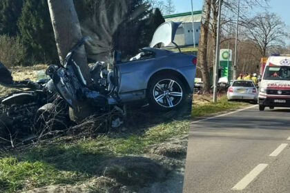 Niebezpiecznie na DW214 w Garczegorzu. Kierowca BMW uderzył w drzewo