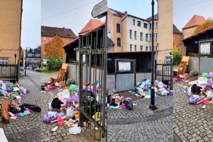 Góry śmieci zalegają przy wiacie śmietnikowej przy ul. Derdowskiego, za Muzeum w…